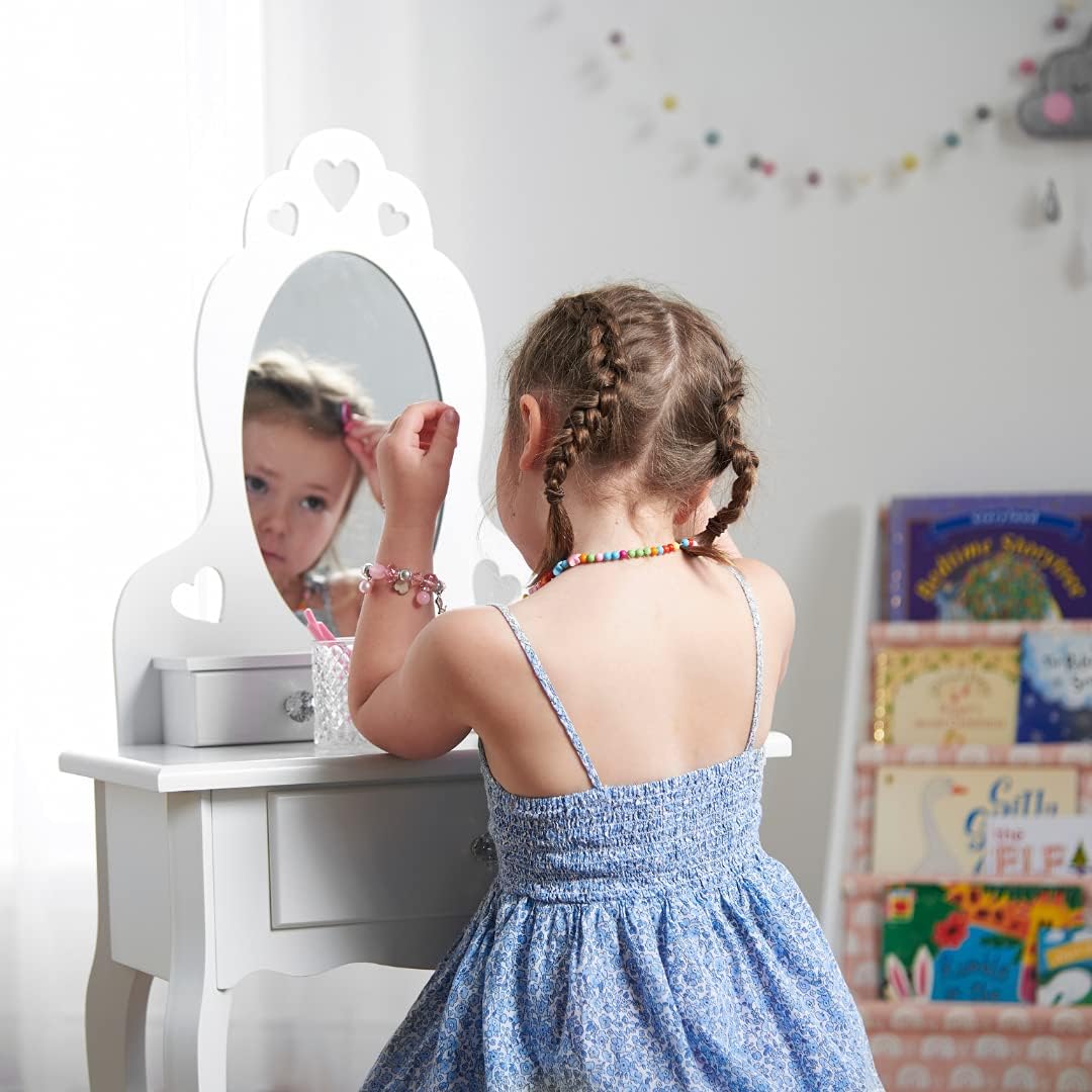 - ★ Elegant Features – Heart shaped designs around the mirror and amazing crystal style drawer knobs make this dressing table a cut above the others. Your little princess will love playing makeup and dressing up using this dressing table and mirror