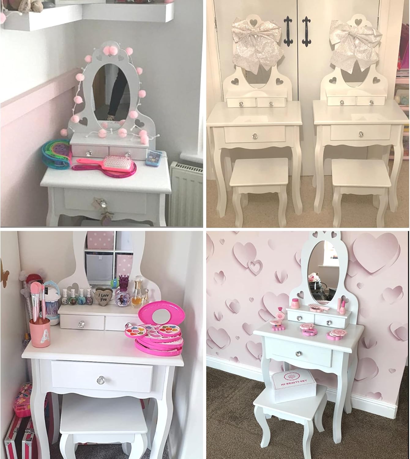 - ★ Beautiful, Unique Design – Created specifically with girls in mind, this gorgeous dressing table with stool and mirror is only available from us. We are proud of our design and confident it will light up any girl’s room