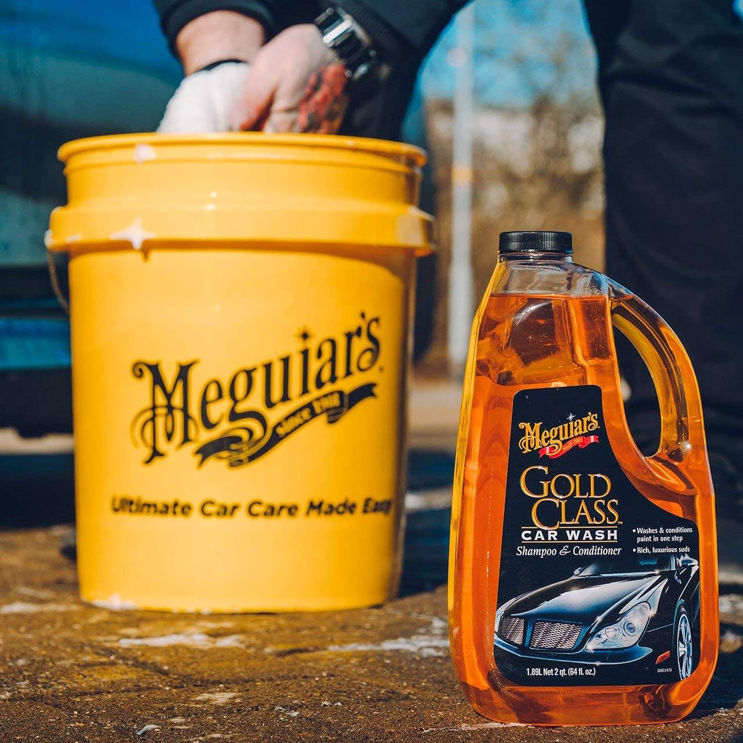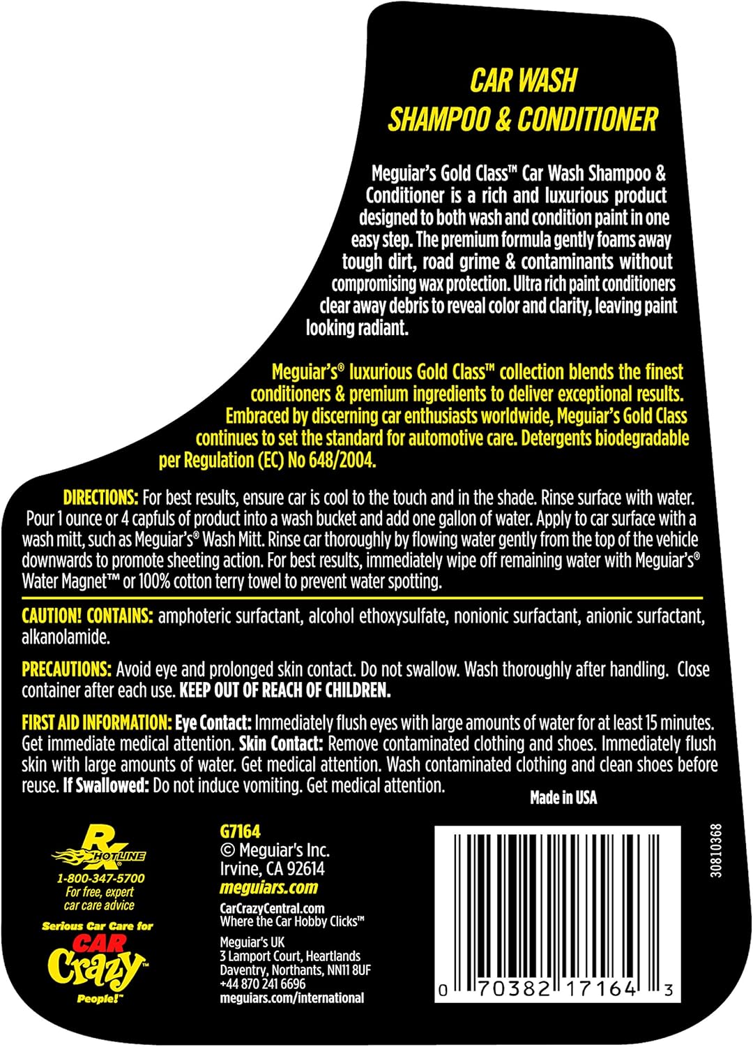 Meguiar’s Gold Class Car Wash Shampoo and Conditioner is designed to clean and condition paint in one step. It features an advanced formula that gently foams away tough dirt, road grime and contaminants without stripping wax protection. This car wash shampoo contains an ultra rich paint conditioner that clears away debris to reveal color and clarity, leaving a radiant look.