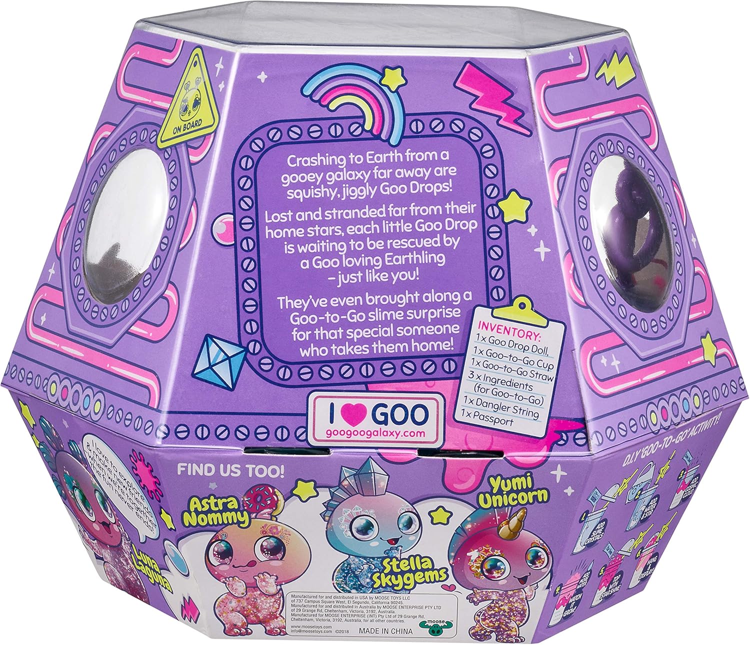 Discover an Out-Of-This-World Unboxing ExperienceThe Goo Drops have arrived in their Space Pods – unbox their pod and explore the interior of their ship to discover cosmic ingredients to make your own Goo-To-Go. Pull the Emergency Hatch to find their Inter-GOO-lactic Passport don't forget to store your Goo Drop in their Goo Pod when you're not playing with them! |