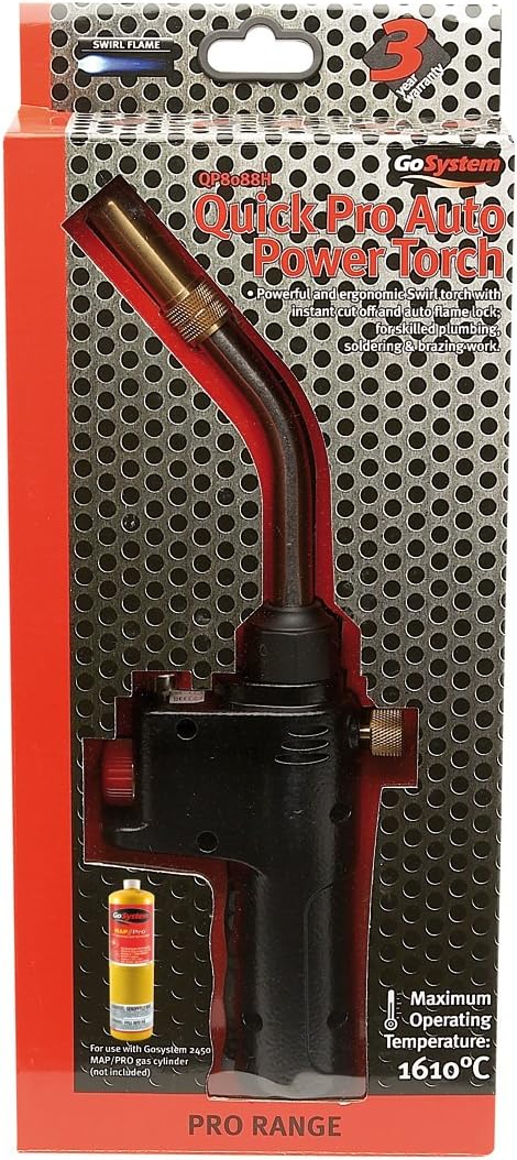 The GoSystem Quick Pro Auto Swirl Torch is ideal for plumbing , brazing and automotive with instant FLARESAFE. The swirl flame gives more even distribution of heat wrapping around the target and joins and repairs a range of metals. Recommended to be used with GoSystem G2400 Propane or 2450 Map /Pro gas cylinder. <BR><P>Features: Gas Consumption 136 g/h; Flame Temp 1500 C; Optimum Power 1900watts.