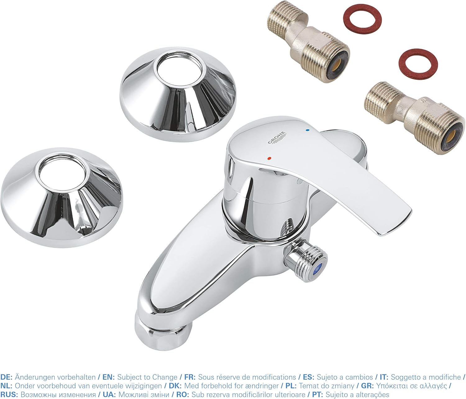 GROHE EurosmartEinhand-Brausebatterie, DN 15WandmontageGROHE SilkMove 35 mm Keramikkartuschemit TemperaturbegrenzerGROHE StarLight Oberfl盲chevariabel einstellbare MengenbegrenzungBrauseabgang unten 1/2”mit integriertem R眉ckflussverhindererS-Anschl眉sseEigensicher gegen R眉ckflie脽enchrom