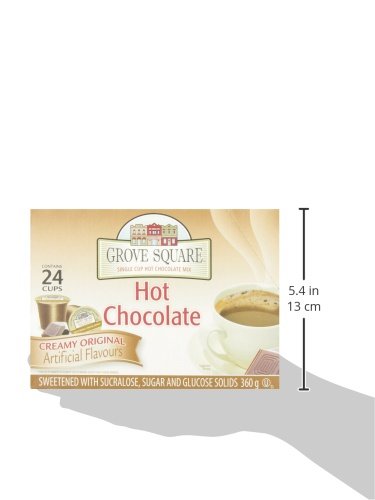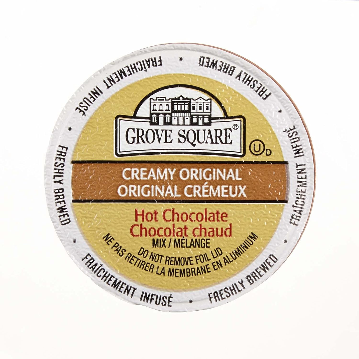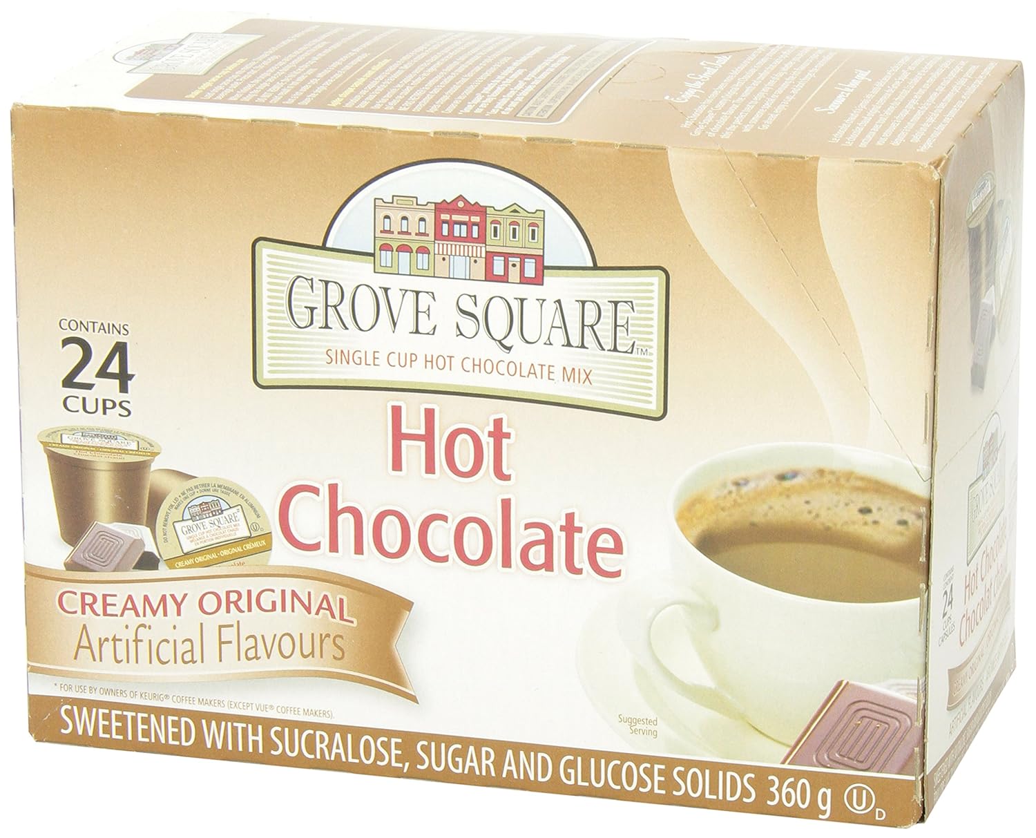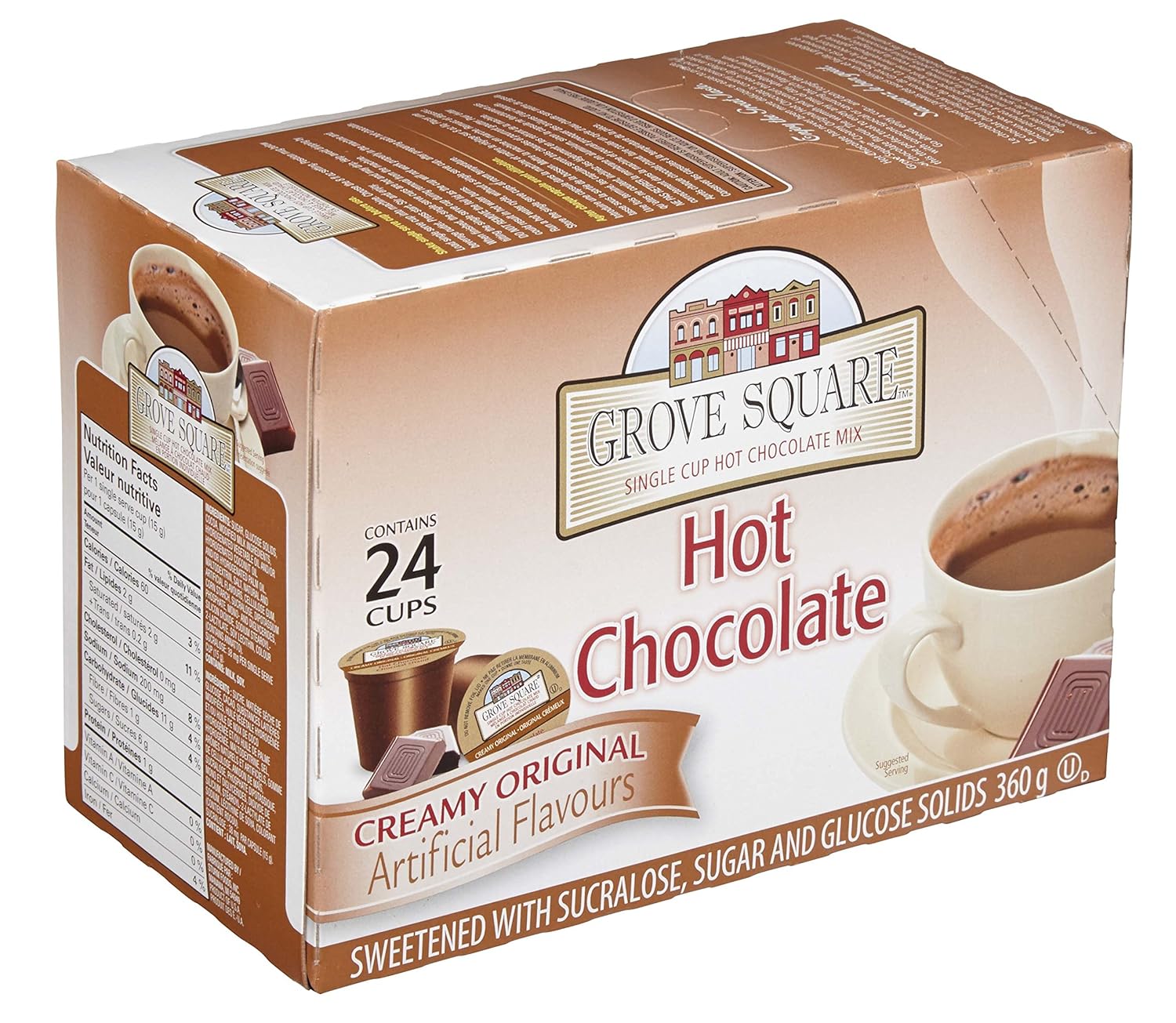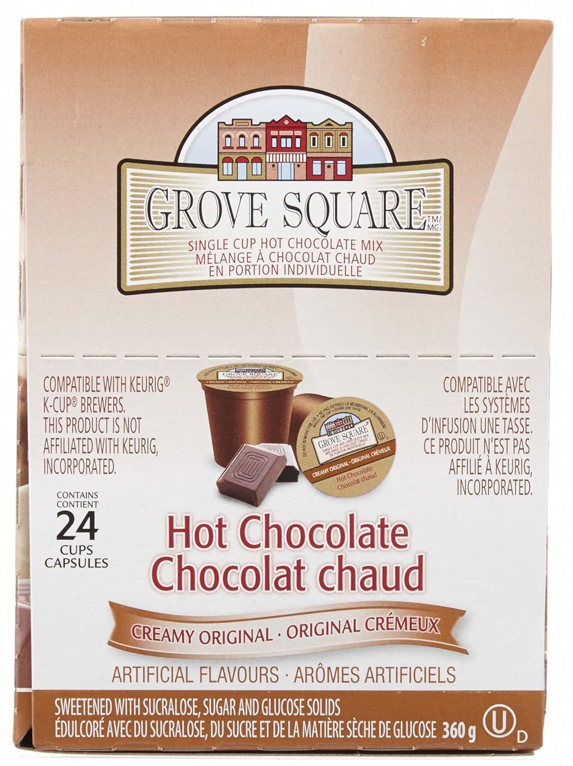 Hot chocolate has never been more delicious or easier to prepare. Grove Square Creamy Original Hot Chocolate is creamy smooth and full of chocolate flavour. The warmth and comfort that each sip offers makes this the perfect treat to enjoy any time of day, whether you are sharing it with someone special or savouring the rich flavour on your own. Go ahead, enjoy a cup… and don’t forget the marshmallows! Hot chocolate beverage. 24 single serve capsules per box. Keurig and K-Cup are registered trademarks of Keurig Green Mountain Inc. Ingredients Sugar, glucose solids, cocoa, modified milk ingredients, hydrogenated vegetable oil and/or hydrogenated coconut oil and/or hydrogenated palm oil, salt, maltodextrin, natural and artificial flavours, corn starch, dipotassium phosphate, sucralose, mono-and diglycerides, silicon dioxide, soy lecithin, colour (contains annatto). Contains: Milk, soy.Compatible for use with Keurig K-Cup Brewers (including Keurig 2.0).
