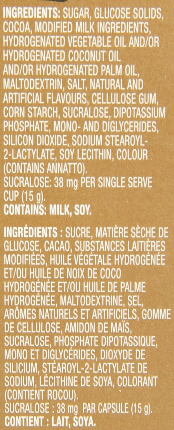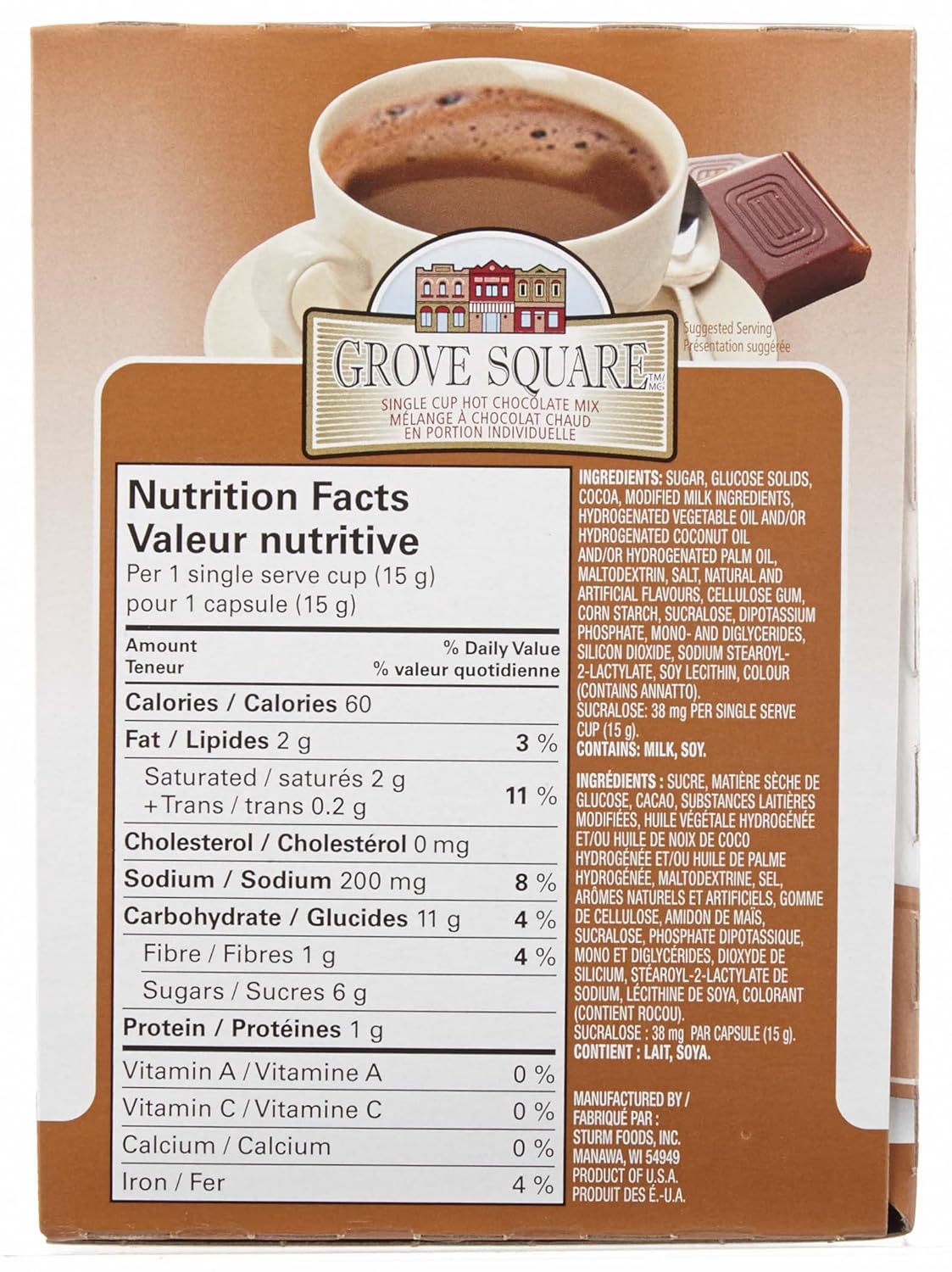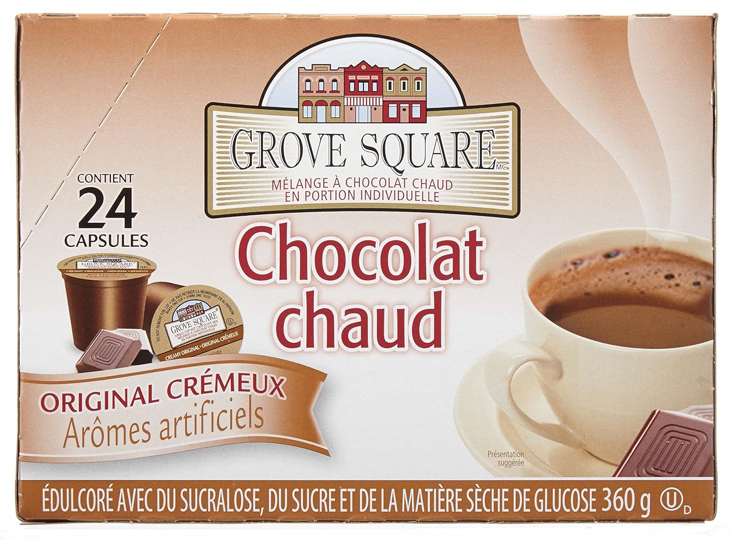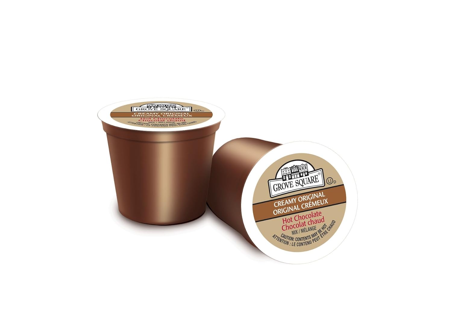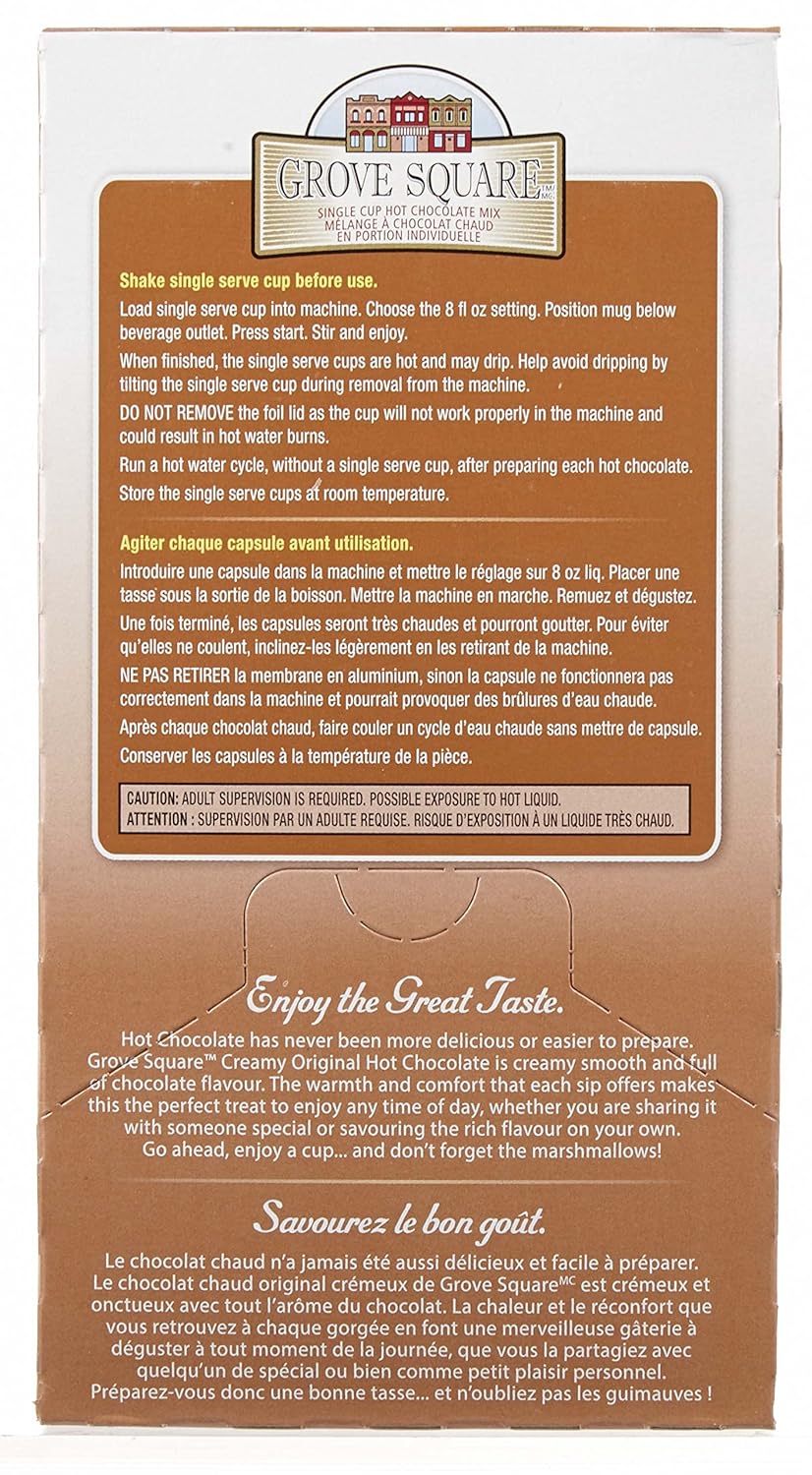 Hot chocolate has never been more delicious or easier to prepare. Grove Square Creamy Original Hot Chocolate is creamy smooth and full of chocolate flavour. The warmth and comfort that each sip offers makes this the perfect treat to enjoy any time of day, whether you are sharing it with someone special or savouring the rich flavour on your own. Go ahead, enjoy a cup… and don’t forget the marshmallows! Hot chocolate beverage. 24 single serve capsules per box. Keurig and K-Cup are registered trademarks of Keurig Green Mountain Inc. Ingredients Sugar, glucose solids, cocoa, modified milk ingredients, hydrogenated vegetable oil and/or hydrogenated coconut oil and/or hydrogenated palm oil, salt, maltodextrin, natural and artificial flavours, corn starch, dipotassium phosphate, sucralose, mono-and diglycerides, silicon dioxide, soy lecithin, colour (contains annatto). Contains: Milk, soy.Compatible for use with Keurig K-Cup Brewers (including Keurig 2.0).