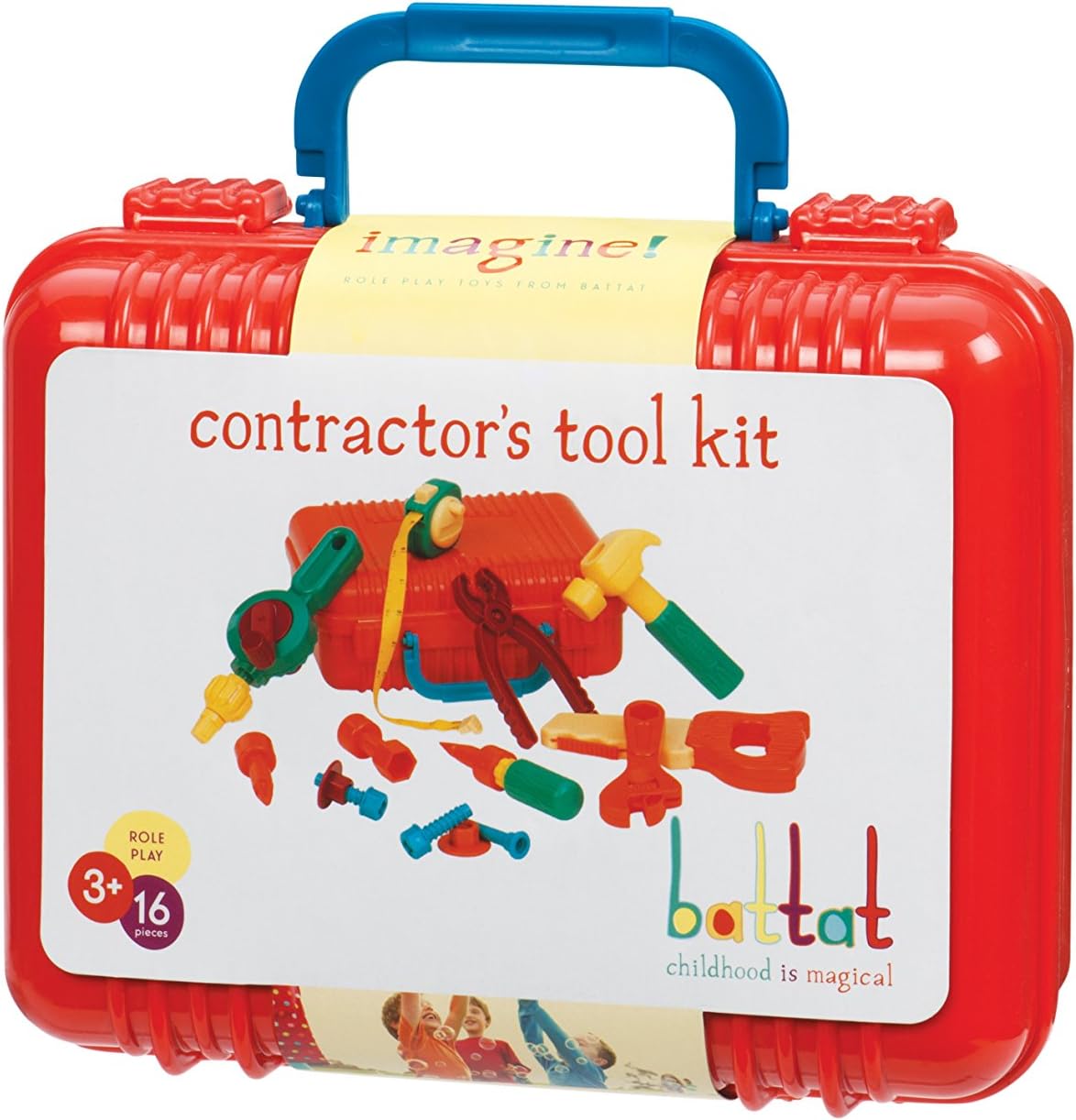 Build until your hearts content with the Battat Contractor’s Tool Kit! This tool kit is stocked with imagination-ready fun, and lots of handy tools of course! Playing with the Contractor’s Tool Kit is the perfect way to stimulate imaginations through role-play and the chunky pieces are easy for little hands to hold. 16 piece set includes 1 screwdriver and 3 bits, 1 hammer, 1 nail, 1 hand drill, 1 pair of pliers, 1 saw, 1 tape measure, 1 wrench, 2 bolts, 2 nuts and 1 contractor’s carry case.
