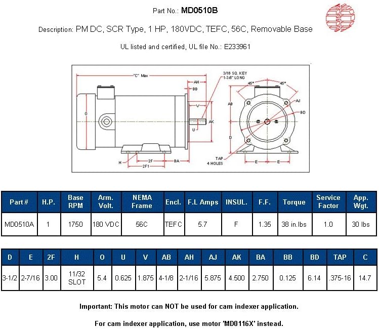 Hallmark Industries DC motor, 1Hp, 1750 RPM, 180 VDC, 56C TEFC, variable speed capable, UL listed, UL File no.: E233961