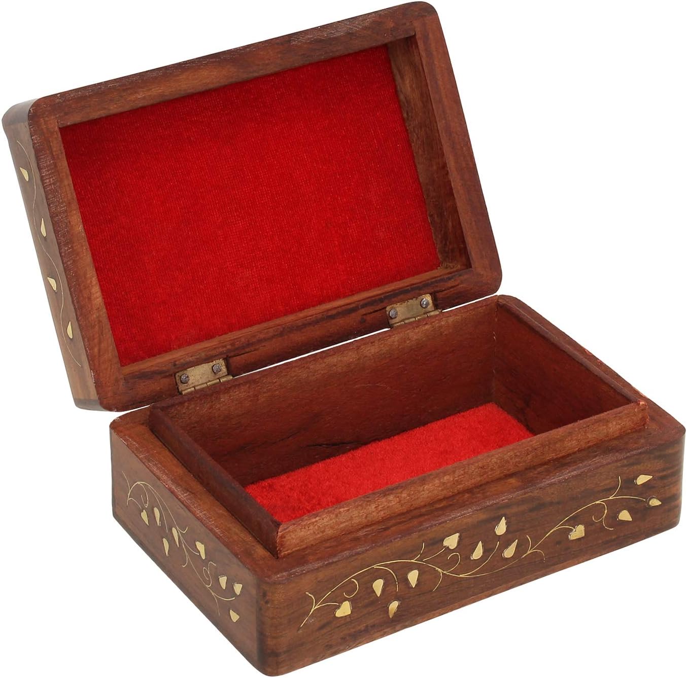 Hand Crafted Wooden Decorative Trinket Jewelry Box Organiser with Mughal Inspired Floral Carvings & Brass Inlay-Centre Flower by Super India