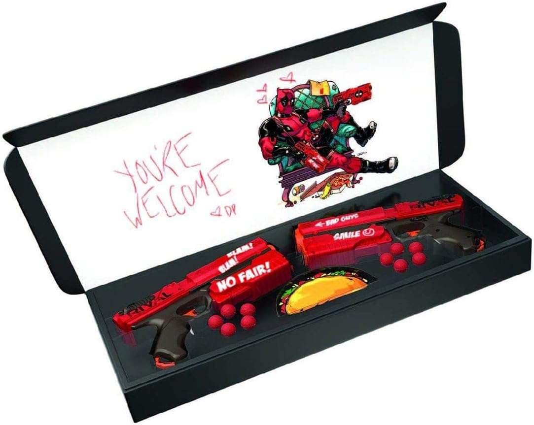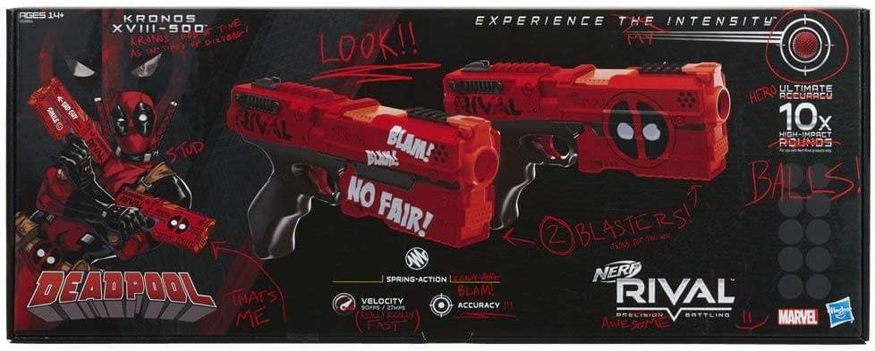 Intensity. Attitude. Tacos. It’s Nerf Rival meets Deadpool, and that means the battle will never, ever be the same. These 2 blasters have all the features of the Nerf Rival Kronos XVIII-500 blaster, but with the look — and the snarkiness — of Deadpool, that don’t-call-me-a-hero bad boy from Marvel Comics. Experience the intensity and attitude of the Nerf Rival Deadpool-themed Kronos XVIII-500 blaster 2-pack!