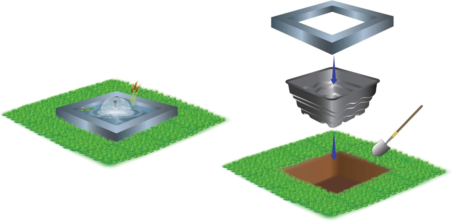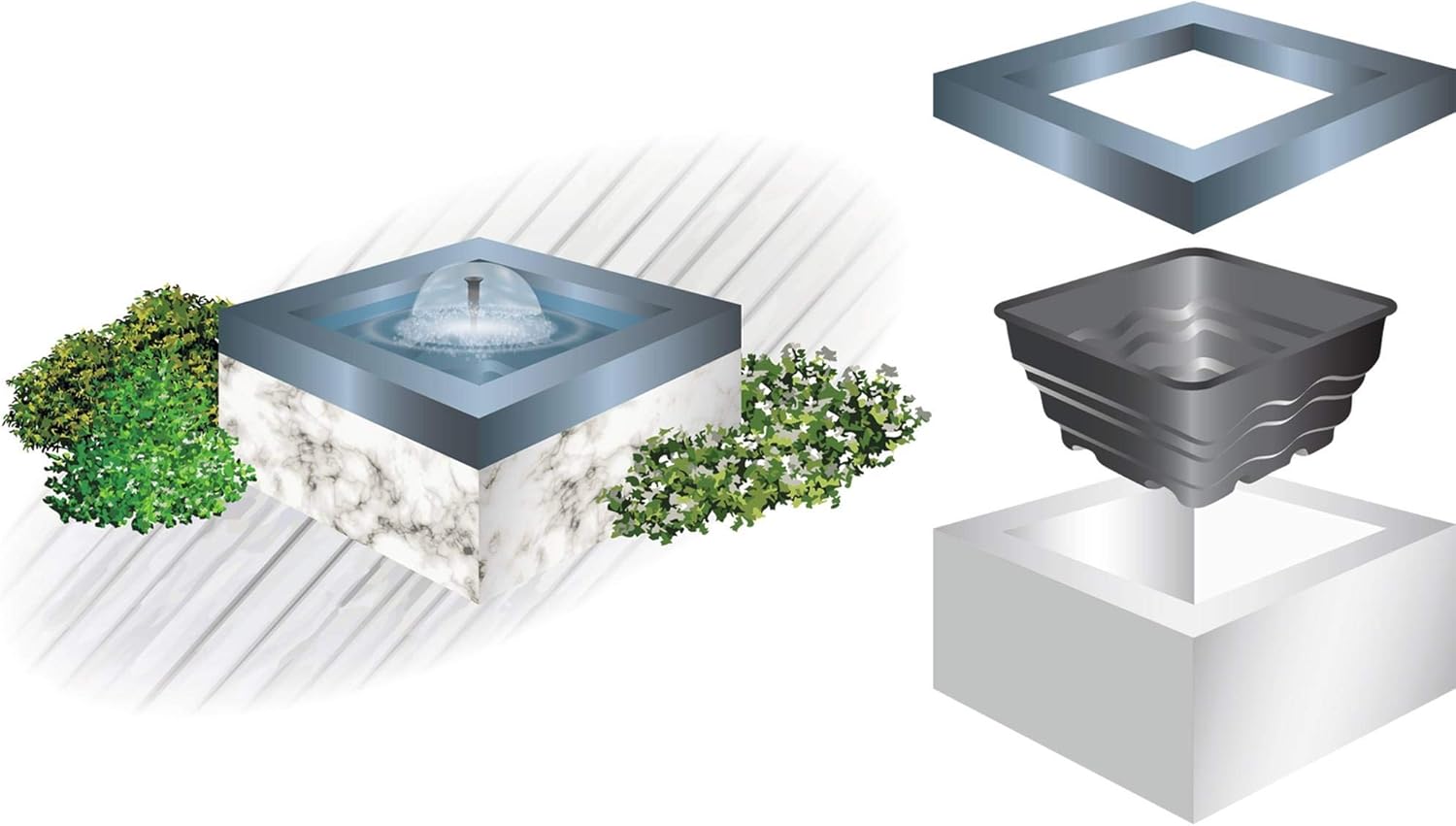 Create an attractive water feature with this ready to use high density polyethylene pre-formed water garden. This modern pre-formed water garden is 58cm x 58cm x 30cm with a water volume of 70 litres. This is suitable for using as a small ponds, for creating fountains, as a planter or terrace/patio pond/floor fountain. Compact size – optimal pool depth that can be combined and extended with overflow edges.