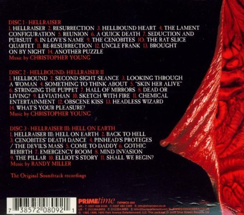 Liverpool-born Clive Barker has forged his macabre visions into a virtual literary/film/art empire. The early epicenter of that domain was the Hellraiser series, a demonology originally informed by Barker’s distinctly dark sense of style and storytelling. Crucial to their evocative atmospheres were musical scores (the first three of which are collected here) that eschewed much of the contemporary horror/slasher genre’s electronic synth’n’shriek sensibility for sweeping gothic orchestral concertos that played off decades of fright-film tradition, yet brought a tragic human melancholy to the table as well. Christopher Young’s masterful soundtrack for the first film sets the tone: Hammer horror visited by the enticing ghosts of 20th century modernism-past. The composer’s second installment explores more sonically mysterious terrain, veering from diabolic walls of percussion and demonic choirs to the eerie sounds of a hellish carnival midway. Randy Miller expands on Young’s work, informing the saga’s third installment with a driving, percussive sense that’s more traditionally action-film oriented in its approach, yet economically effective in its own right. This limited edition (3000 copies) three-disc set archives the scores for the original three films (as well as an informative new booklet) in an elaborate, fold-out puzzle box inspired by the films’ own mysterious central prop. –Jerry McCulley