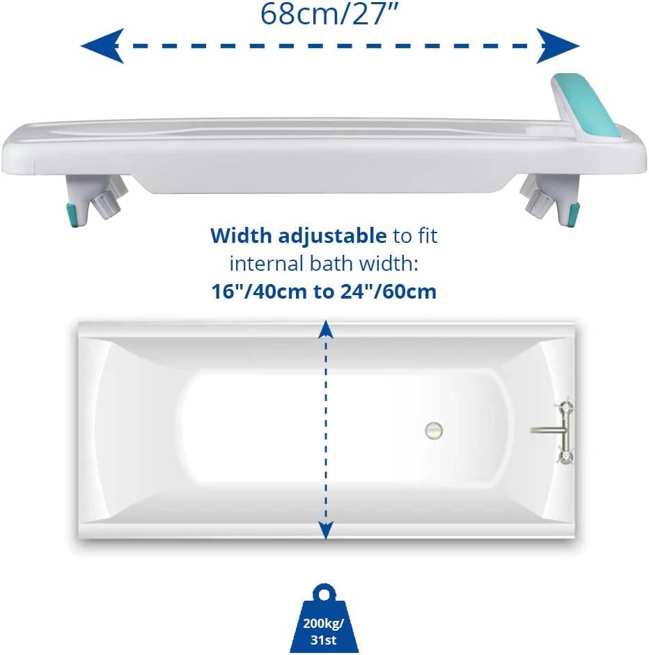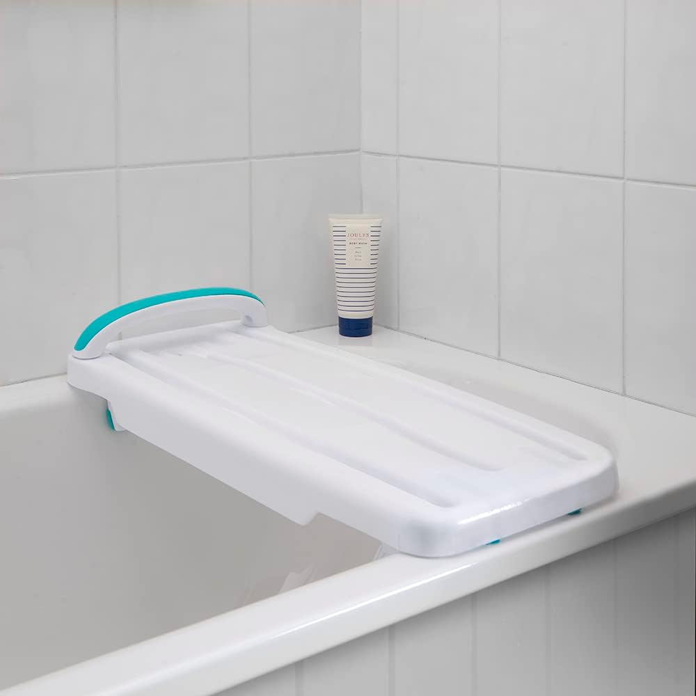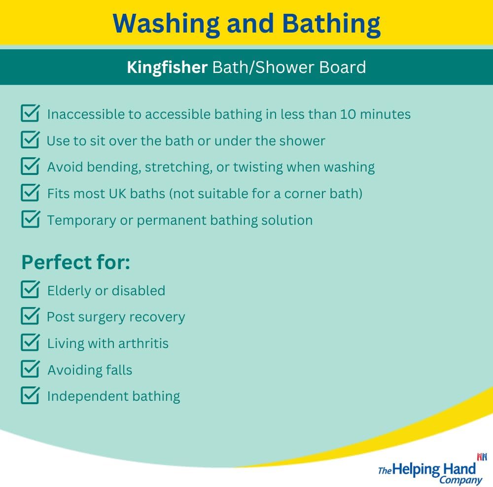 Made in the UK, Kingfisher bath aids for getting into and out of bath are designed for someone who finds it difficult to get in or over the bath safely and easily. The Healthcare professional’s choice – a very useful product to manage getting in and out of the bath independently without worry of slipping or falling. Maintain dignity to wash yourself without having to ask for help. Sit on to the bath board to wash yourself in the bath water below or use as an over the bath shower. The bath bench can also be a halfway point to then transfer down into the bath or onto the Helping Hand bath seat (sold separately) Use the safety handle as an extra support to get on and off the bath board, making sure the board is fitted with the handle end closest to the bathroom wall. Integral drainage slats ensure a non-slip surface as the water flows away quickly. There is no danger of trapping skin. Please check your internal bath width before purchasing. Width adjustable to fit 16” – 24” wide. This one bathboard for disabled and elderly will fit the majority of baths. Assemble the bath seat by sliding the feet onto the underside and tightening in place with the feet firm to the side of the bath. No tools are required. The angled feet will fit the side of shaped baths and right up into the curve of the bath at the back to be able to stretch out legs fully. Full instructions are included. It is not suitable for corner baths. The bath board is warranted for 3 years but will last for many years if used correctly. Easy to clean using non-abrasive cream cleaners. Spare parts are readily available. The lightweight bath aid weighs only 1.45kg and is easy to remove when other people want to use the bath or take with you when travelling. The bath board is suitable for up to 200kg / 31 stone. It can be used on its own or in conjunction with the Helping Hand Bath seat. Have you seen the range of Helping Hand long handled bathing accessories – top to toe sparkling clean without struggling to bend.