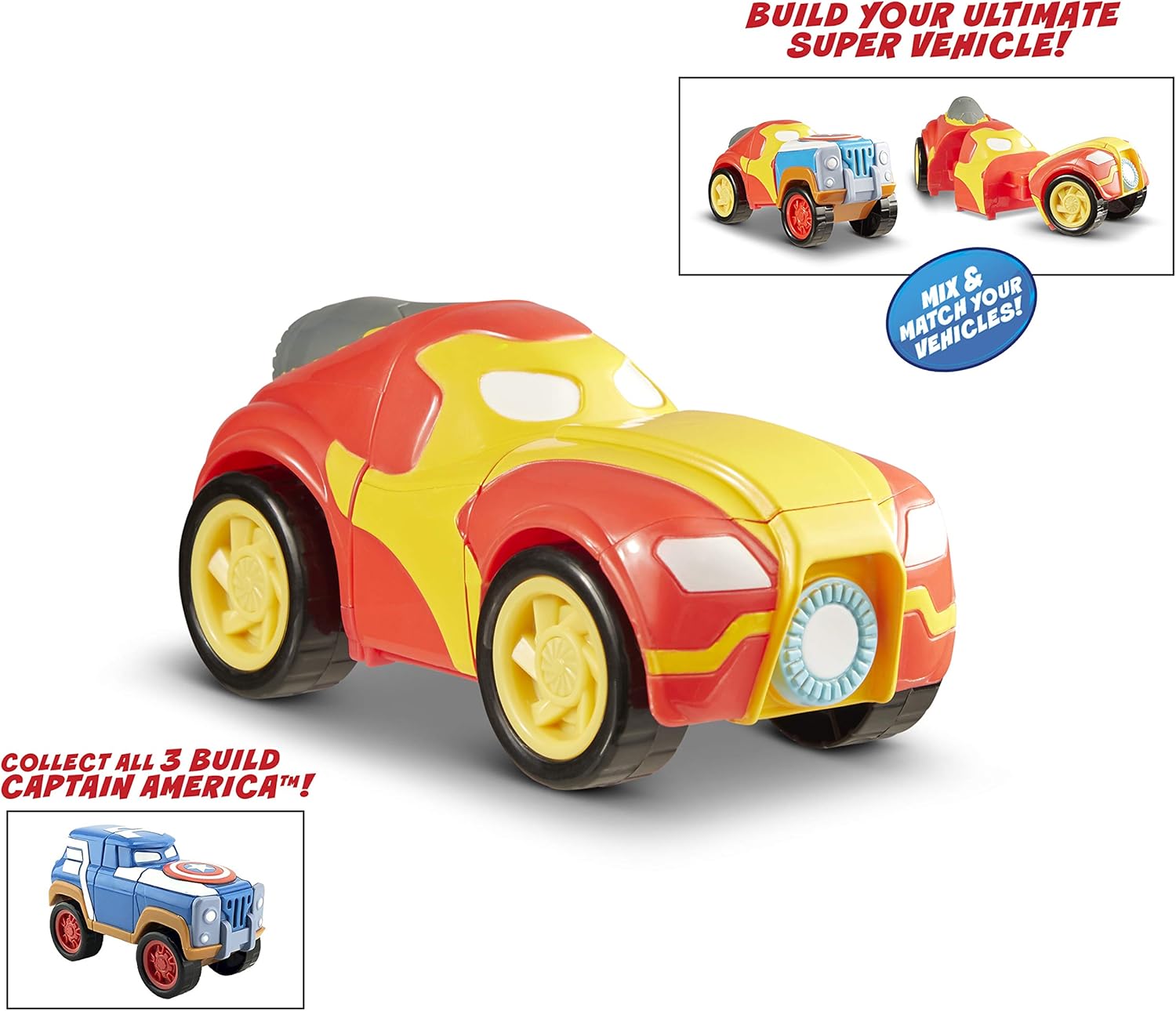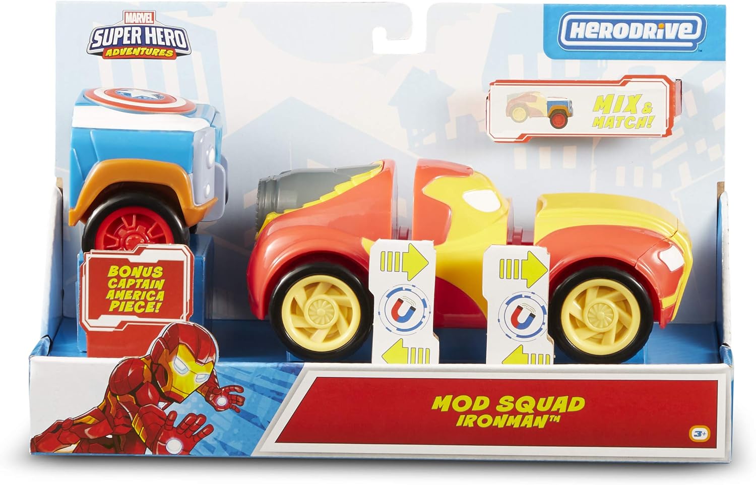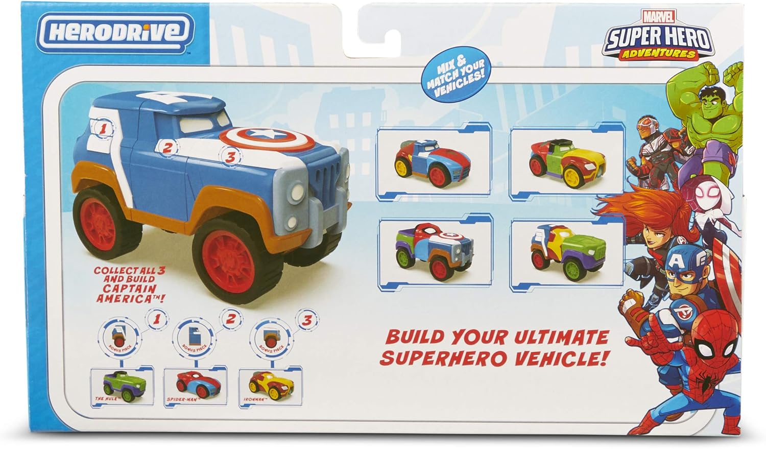 Combine the ultimate superhero forces with HeroDrive mod Squad! These fast free-wheeling toy vehicles feature the greatest Marvel superheroes: Spiderman, Ironman, and the Hulk! Mix and match pieces to create a custom hero, or connect unlimited pieces. Each vehicle comes with a bonus piece of Captain America for immediate mix and match action. Collect and connect forces with the HeroDrive Marvel mod Squad Spiderman, Hulk and Ironman toy vehicles! Each free-wheeling PVC Marvel toy vehicle comes in 3 modular pieces for easy Mix and match play! Mix pieces to create a custom hero! Each vehicle comes with a bonus piece of Captain America for immediate mix and match action. Collect all 3 to complete Captain America!