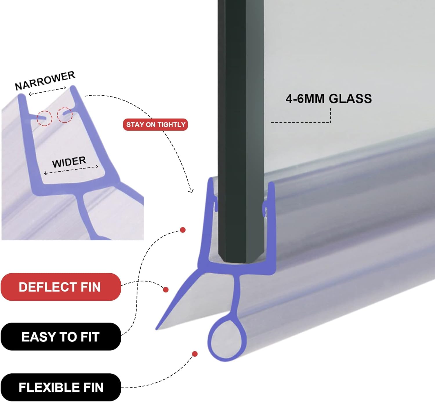 Fits 4-6mm Thickness Glass, up to 10mm gap between glass door and bath or Floor Fits for stright/curved shower screen, glass door Flexible Rubber plastic, Translucent finish Soft bottom fin For curved screen, please soak the seal in the warm water for 10minutes, and apply to curved screen when it gets soft. (May not fit if it is a big angle curved glass Easy to install, just simply push onto the glass, no tools needed, Cut to size if required Durable seal, long lasting and flexible