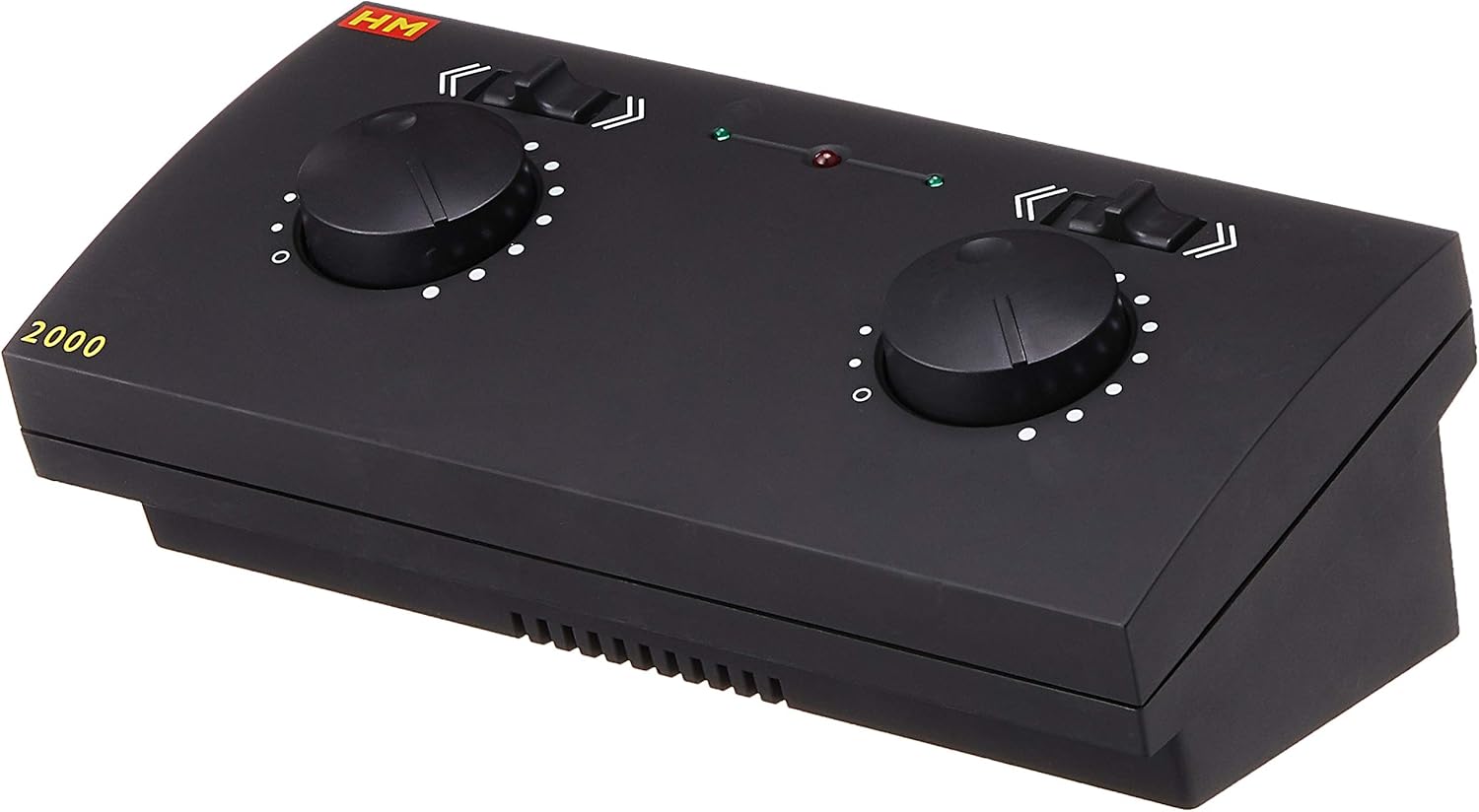 A complete transformer and speed control unit with built-in control for two separate trains, extendable to four trains by adding slave control units (hm2000+). Power output is two amps, with compensation to regularize speed under varying conditions of load. ‘Positive off’ rotary speed control cuts all power when the control knob is turned to zero. Features include forward and reverse switch, plus led indicators for mains supply and output power. Outputs include non-variable ac and dc power for point motors and other powered accessories.