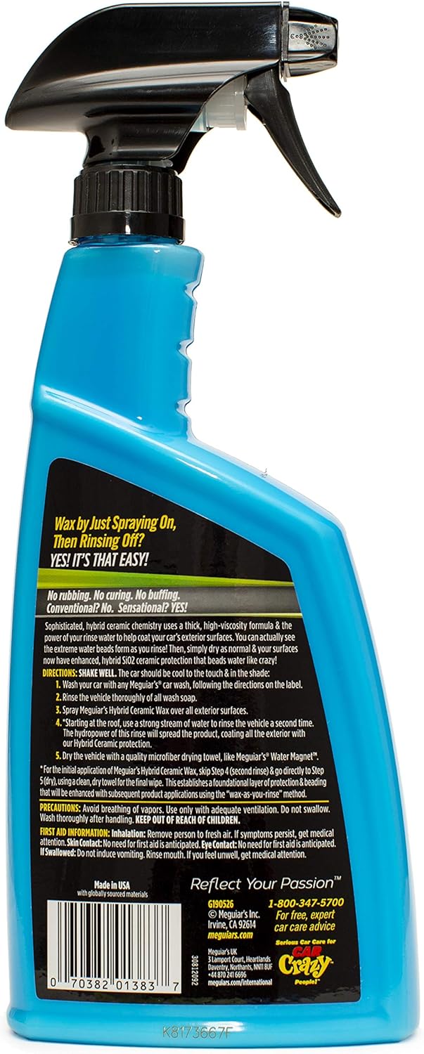 Do you want an easy to use car wax that with cutting-edge, sophisticated technology delivers the latest in protection? Meguiar’s Hybrid Ceramic Wax is the answer. With all-new, advanced Si02 hybrid technology you get ceramic protection that’s so easy to use, you can actually wax your paint as you rinse off your car! After washing and rinsing off the soap, simply spray on Meguiar’s Hybrid Ceramic Wax and then follow that with a second rinse with a strong stream of water. This final rinse helps to spread and lay down the wax evenly for you. Dry your vehicle like you would normally with a quality microfiber drying towel, like Meguiar’s Microfiber Water Magnet Drying Towel. There’s no rubbing or buffing and there’s no curing time. You’re left with ceramic protection and durability well beyond conventional wax and extreme water beading protection. Conventional? No. Sensational? YES! It’s Ceramic made easy!