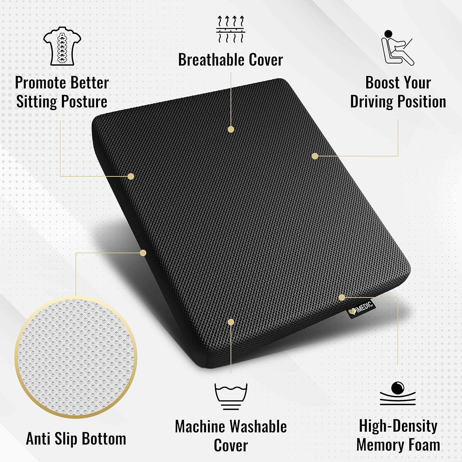 iMedic – Memory Foam Seat Cushion for Office Chair, Posture Correction, Pain Relief – Height Boost – Orthopaedic Car Seat Cushion with Washable, Breathable 3D Mesh – with Anti Slip Bottom – Black