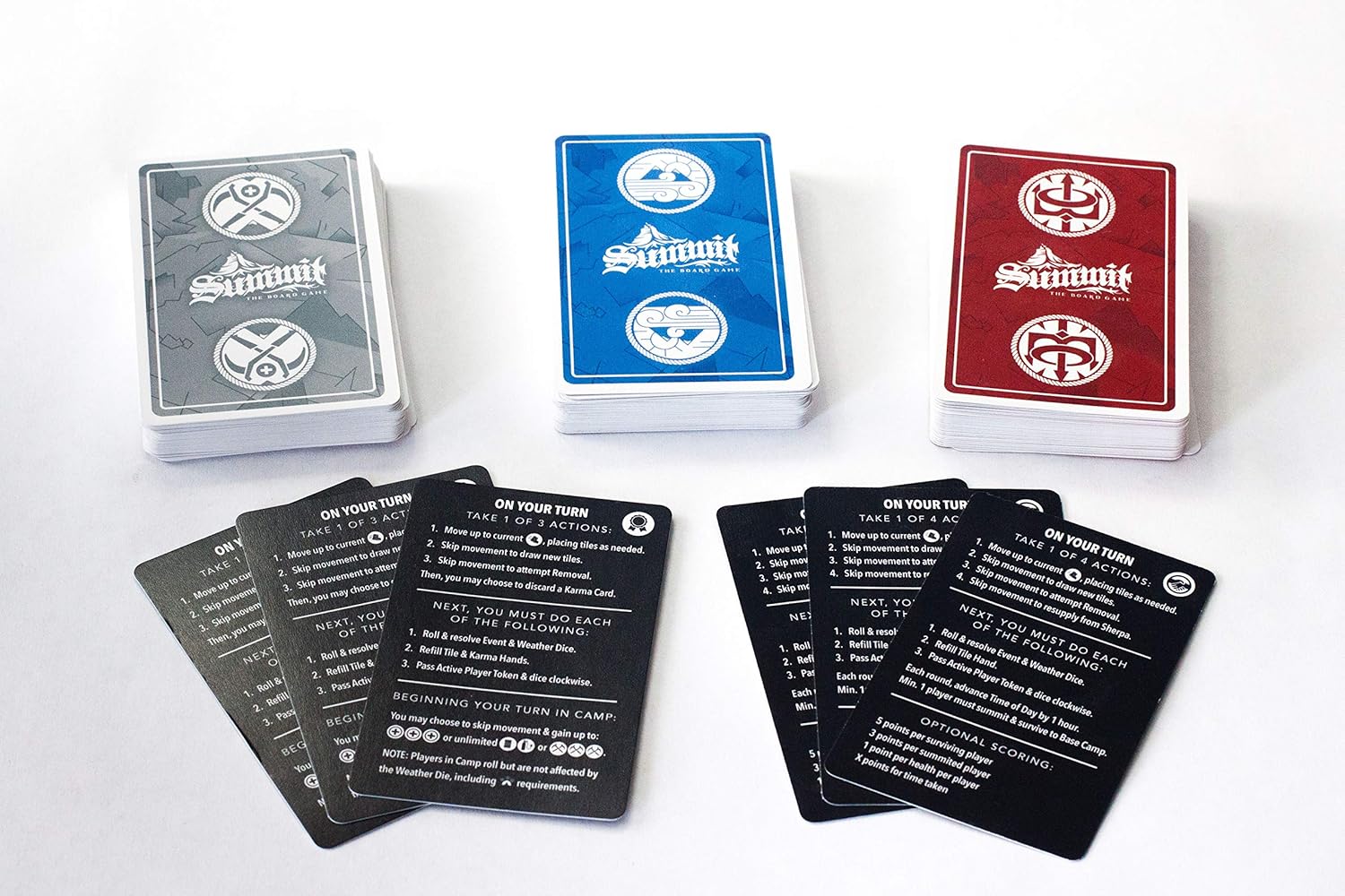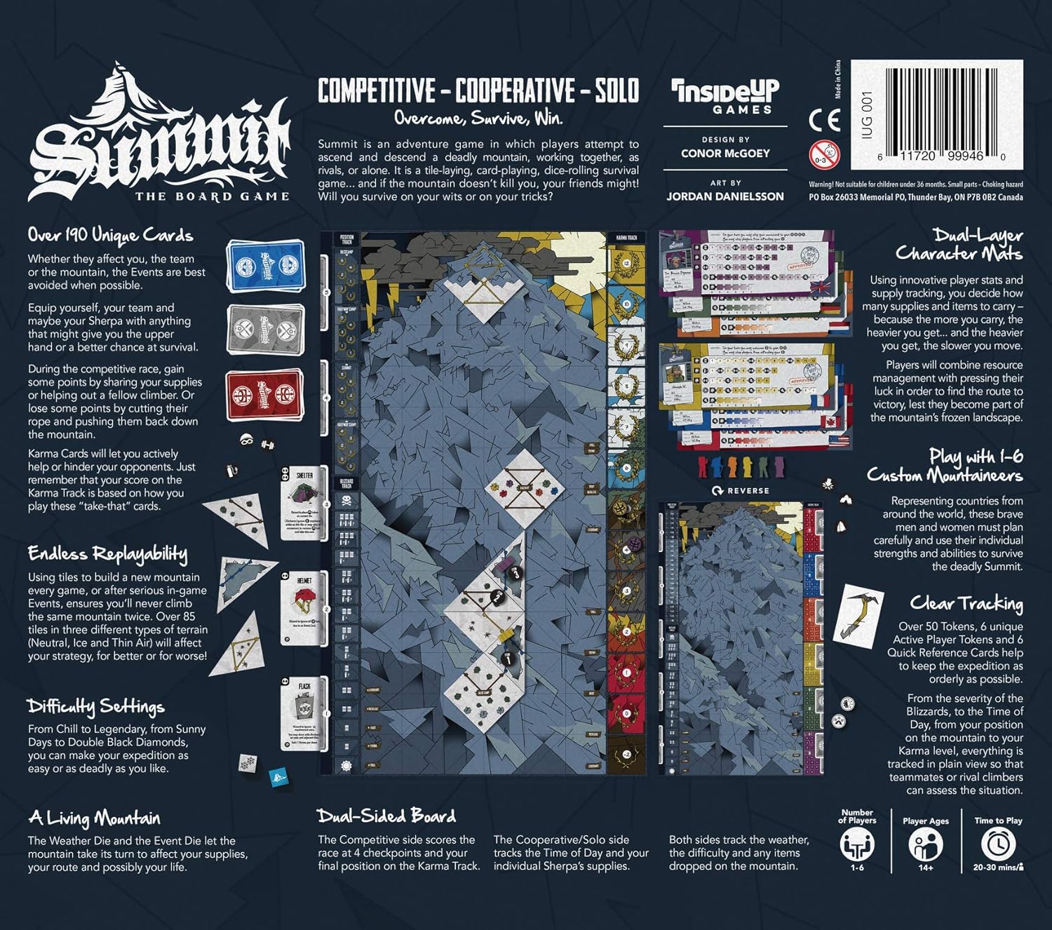 Summit The Board Game is a survival game which, thanks to it’s two-sided game board and variable mechanics, can be played competitively, cooperatively or solo. Players attempt to ascend and descend a deadly mountain, working together as rivals or alone. It is a tile-laying, card-playing, dice-rolling survival game…and if the mountain doesn't kill you, your friends might!