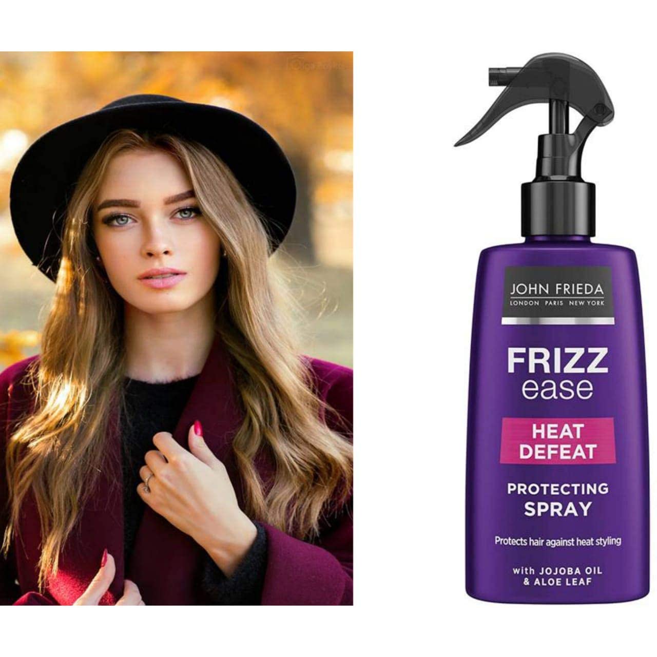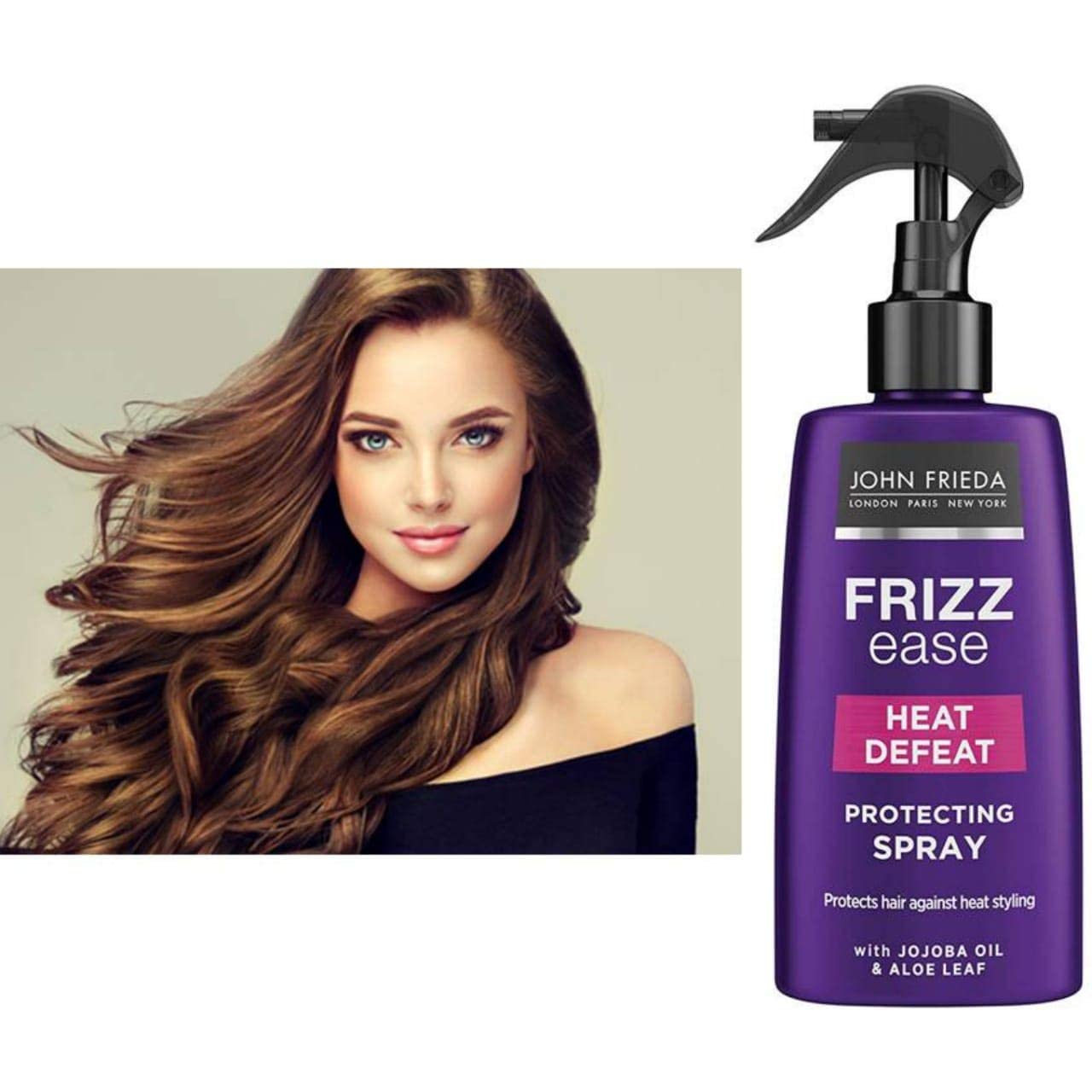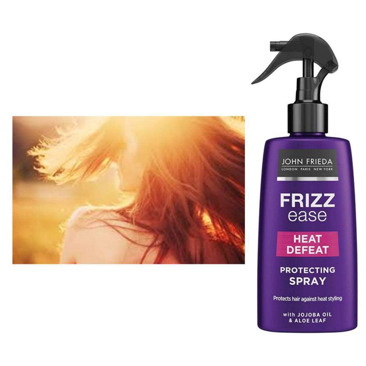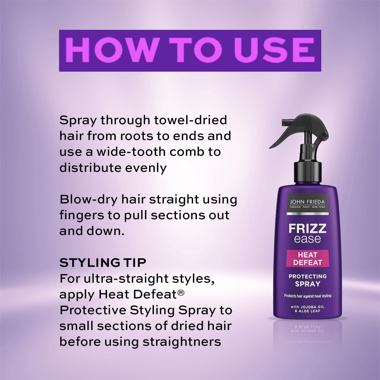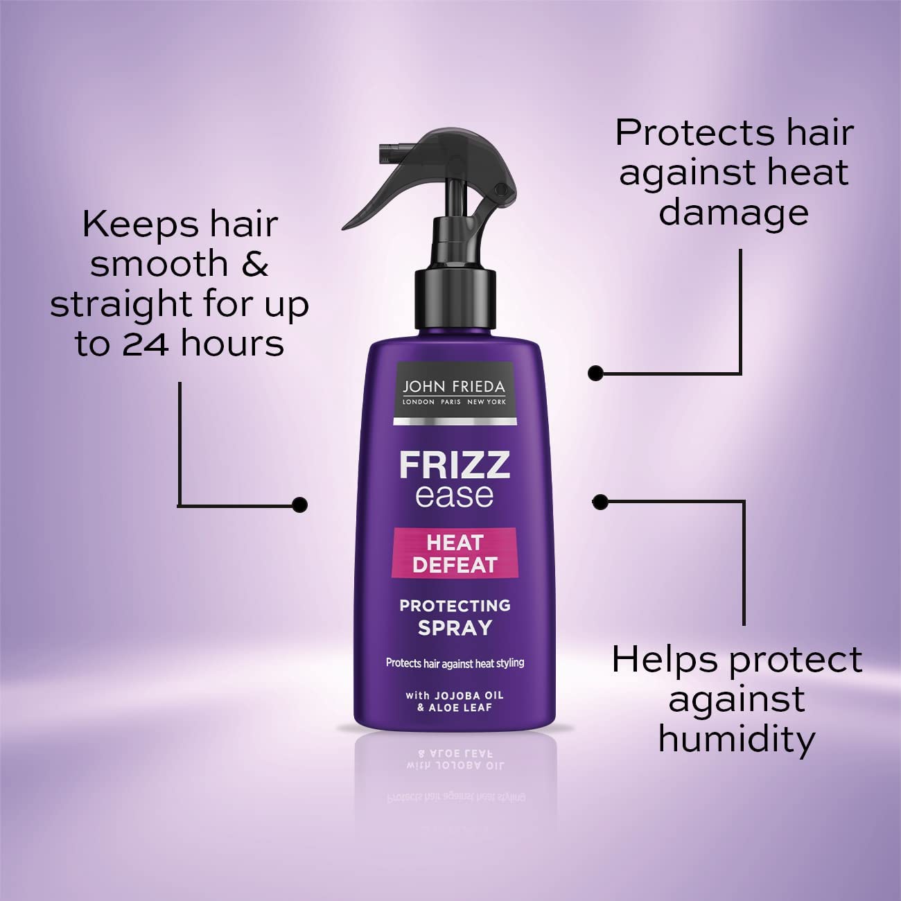 Get fabulous frizz-free hair with John Frieda frizz ease. John Frieda frizz ease heat defeat protective styling spray works with heat tools to condition and straighten strands as it helps block humidity and rehydrate hair for ultra safe styling keeps hair smooth and straight for up to 24 hours. Containing a special Therma Guard Complex, the formula helps protect against damage from heat tools such as blow-dryers and flat irons. With Jojoba oil and humectants, formula silkens strands and replenishes moisture.