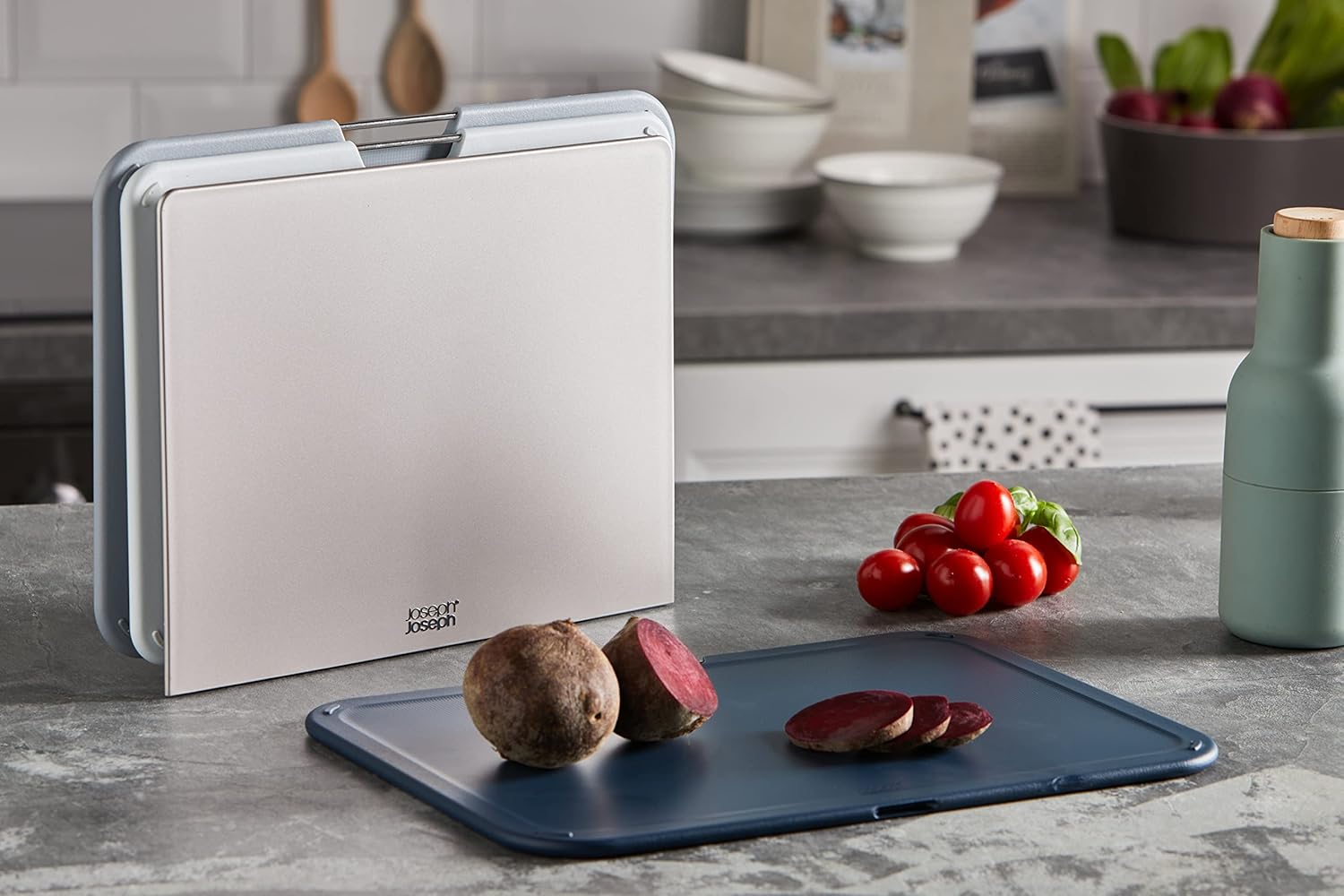 Combining innovative design with distinctive colour has always been an essential part of what makes a Joseph Joseph product special. Now that passion for blending perfect function with beautiful style has led to the creation of Editions – a brand new range of their bestselling products in an irresistible colour palette. Inspired by colours found in the natural world and influenced by trends in design, fashion and interiors, Editions will be updated regularly to create a truly unique range of kitchenware. For the launch issue of this brand new range, Joseph Joseph have taken their inspiration from the myriad of hues found in the ever-changing skyscape above our heads. Editions Sky blends calming tones of dusty blue, azure and cumulus grey to create a stylish collection that fits perfectly with the desire for products that bring serenity and relaxation into the home. If you’re searching for the perfect gift idea or to bring a distinctive touch of colour to your kitchen, look no further than the new Editions range. This smart set of colour-coded chopping boards comes with its own sleek storage stand, making the boards very easy to access and a stylish addition to any worktop. Each board is a different size, catering for a range of food prep tasks, and features an easy-lift stainless-steel bar, non-slip feet and a knife-friendly, textured cutting surface. The stand holds each board apart, allowing air to circulate for even drying, and includes non-slip feet on the base. Board sizes: Small 23 x 32 cm (9 x 12½ inches); Medium 24 x 34 cm (9½ x 13⅜ inches); Large 25 x 35.5 cm (9⅞ x 14 inches)