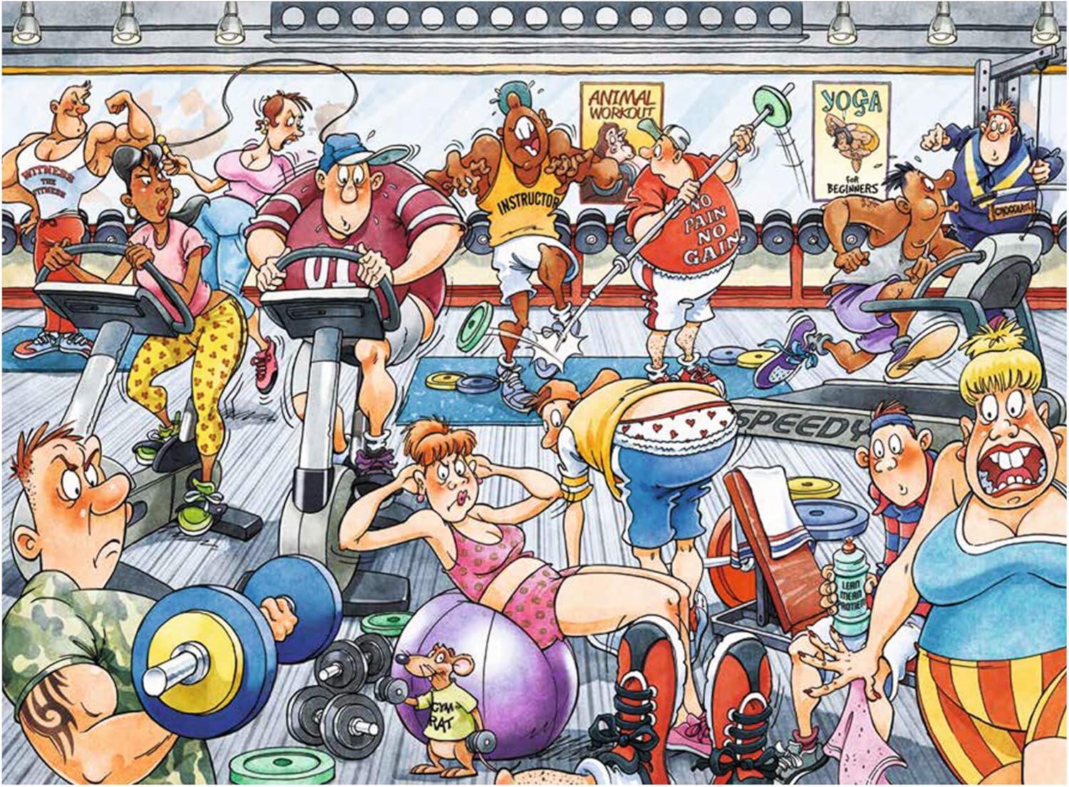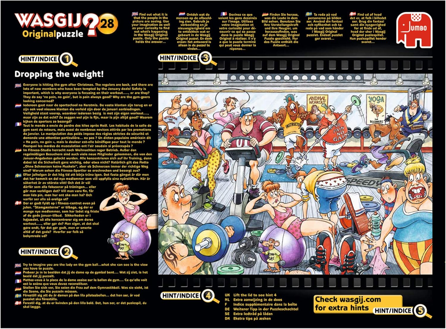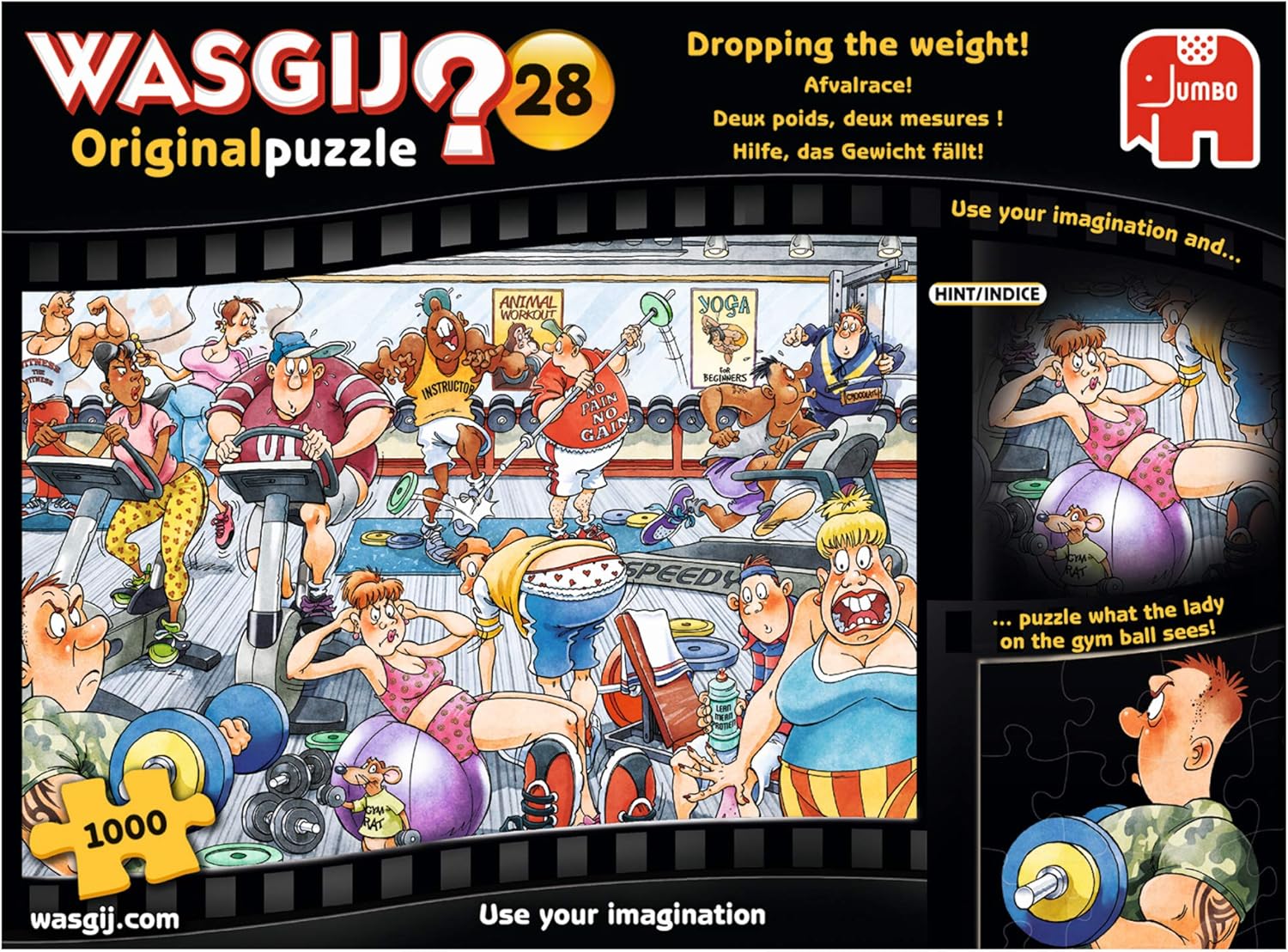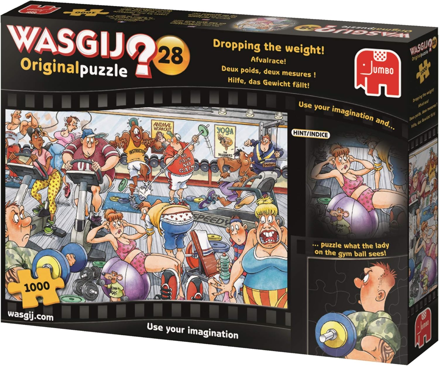 Wasgij Original 28: Dropping the Weight! is the hilariously funny 1,000-piece jigsaw puzzle that sees the start of a New Year with everyone hitting the gym after Christmas! The image printed on the front of the box depicts a crowded exercise room with all the regular gym-goers back in the swing of things, but there are a few new members who are turning heads! While everyone is trying to focus on their exercises, something has caught their eye on the other side of the gym hall. What could be happening to get this surprised reaction from everyone? Try to imagine you are the woman on the gym ball and piece together what she can see. Wasgij Original is the unique brainteaser puzzle concept where you must work out the cause of the scene in the puzzle box image and discover why the characters in the illustration are looking so shocked? Can you use the clues to determine what has happened? Use your imagination and puzzle why everyone is looking so surprised. Remember, only the puzzle holds the answer! Jumbo’s popular artist, Neil Easton, illustrates this fabulous Wasgij puzzle, and Neil’s hilarious sense of humor shines through each of his Wasgij puzzles and is part of why the Wasgij brand has a massive fans base across the world. The completed jigsaw puzzle measures 68 x 49cm when completed. It has been produced on high-quality cardboard using Jumbo’s precision die-cutting techniques to ensure you receive only the highest quality of product and so that each jigsaw piece maintains its original shape for as long as possible.