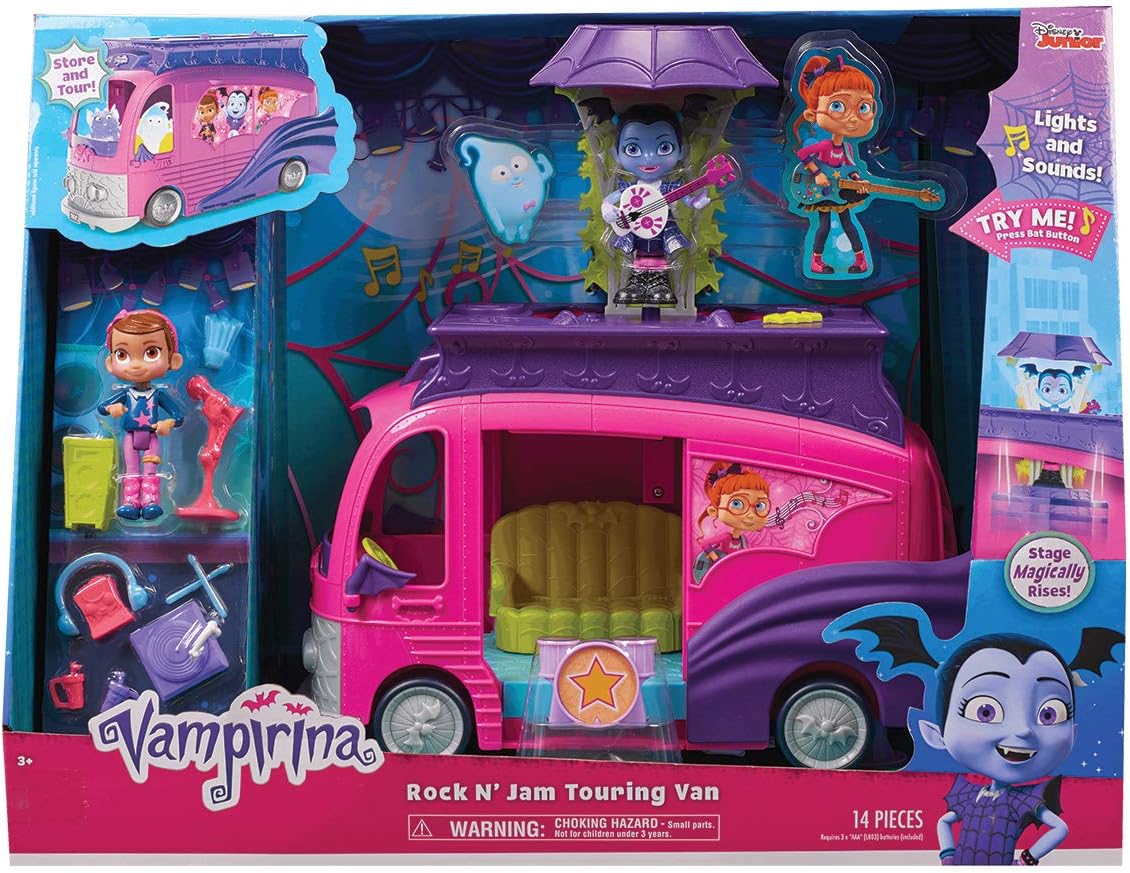 Bring the world of Disney Junior's Vampirina to life with the new Vampirina Rock N' Jam Touring Van! Kids can rock out and go touring with Vampirina and her band, The Ghoul Girls – just like in the show! The Van transforms into a spook-tacular stage and when Vampirina is ready to perform, she magically rises on a light-up platform in true Ghoul Girl rock-star fashion! Vampirina and Poppy can rock out together on stage for their fans! Press the bat button on the stage to activate cool rock and roll music and concert-inspired light-up action! The Van features Vampirina phrases from the show and 2-in-1 transformations of driver's seat that swings out to become a sofa, bunk beds that flip up to reveal speakers, and piano key-styled spiral stairs. The Touring Van comes with Vampirina and Poppy figures, and includes the following rockin' accessories: drum stand and drumsticks, record player, standing microphone, speaker, headphones, Vampirina's spookylele, award, popcorn bag and two cups.