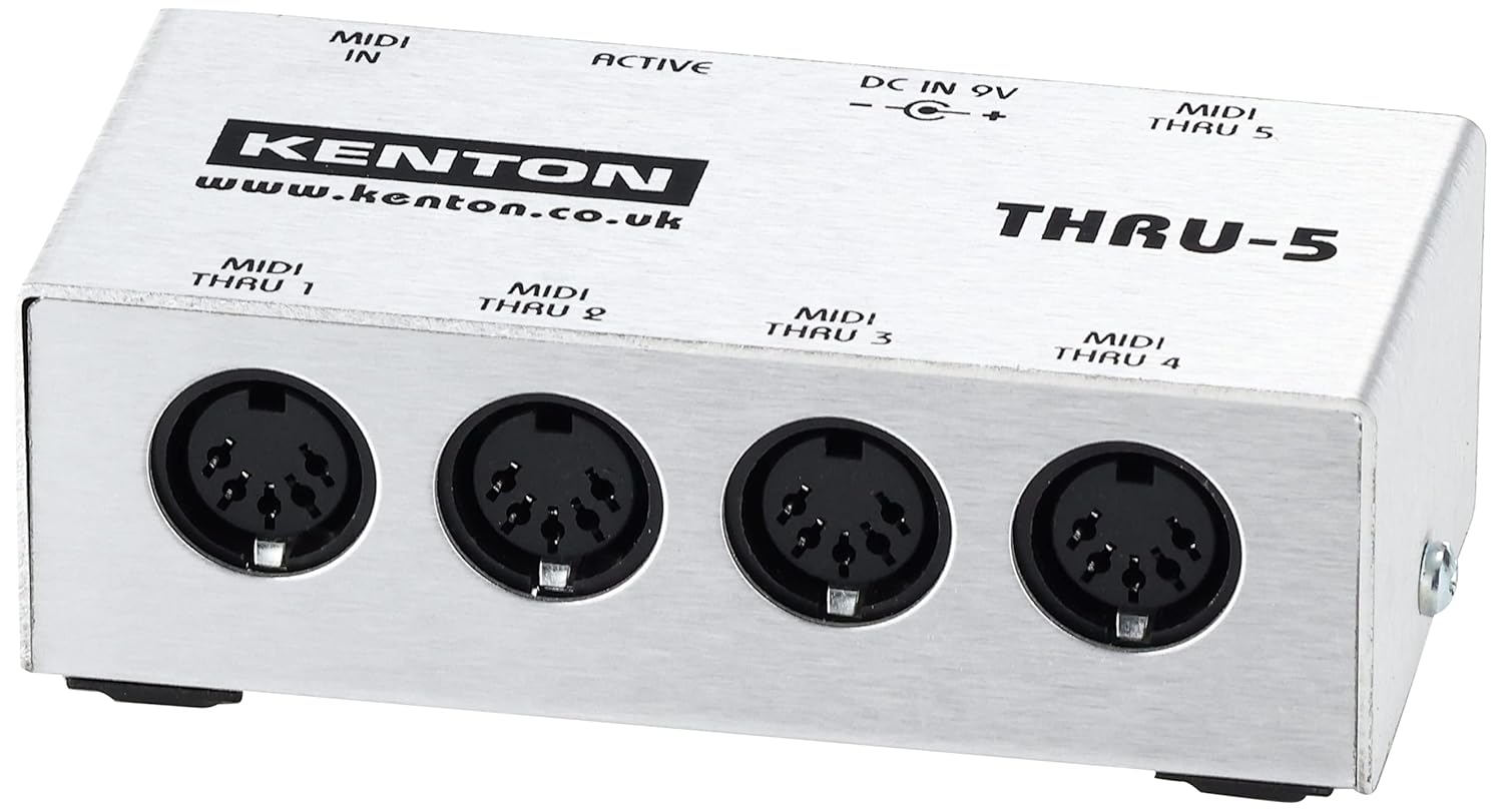 High quality MIDI Thru Box The Kenton Thru-5 has opto-isolated MIDI in and separate drive for each MIDI out. The box is powered from a mains adaptor (wall wart) so you can fit and forget. Features 1 x MIDI In 5 x MIDI Thru’s Includes signal quality restoration circuitry DC power input jack 2.1mm (centre +ve) Power indicator light 9V unregulated power supply included (UK, EU and USA types available) Housed in a metal box so it can withstand the knocks Attractively finished in brushed aluminium with black screen print Dimensions: 100mm x 50mm x 35mm Weight: 600g including power supply