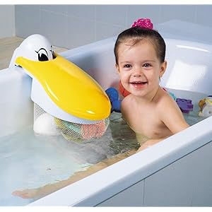 - A great baby bath toy organizer that brings an exciting new element to your child’s bath time. This bath toy storage bag features an adorable pelican that hangs over the side of the tub, making it a suitable and clever way to store your child’s bath toys.