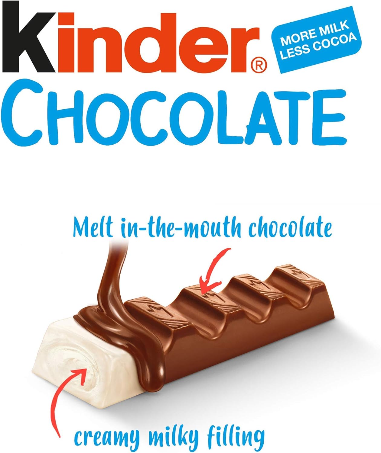 Fine milk chocolate bar with a delicious milky filling, Kinder Chocolate is perfect as a little treat or snack! Great care is taken in making sure that only the highest quality ingredients make it into our products. Kinder is of course the German word for children. Kinder Chocolate was the first Kinder product to be launched in the world, introduced in Germany over 40 years ago. Literally invented for kids, Kinder set new standards for chocolate, developing little Mini Treats bars in a ?kinder?-size portion.The launch of the Snack Bar format followed 20 years later, to enjoy the distinctive Kinder Chocolate taste in a format more suitable for older children.Both Kinder Chocolate Mini Treats and Snack Bars were fully introduced in the UK and Ireland in 2001. Each year they are going from strength to strength as mums become increasingly familiar with the great taste of Kinder Chocolate.