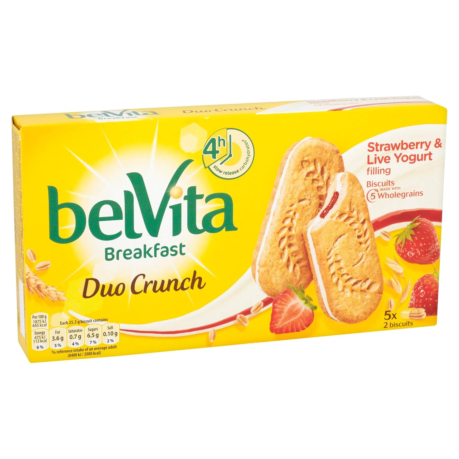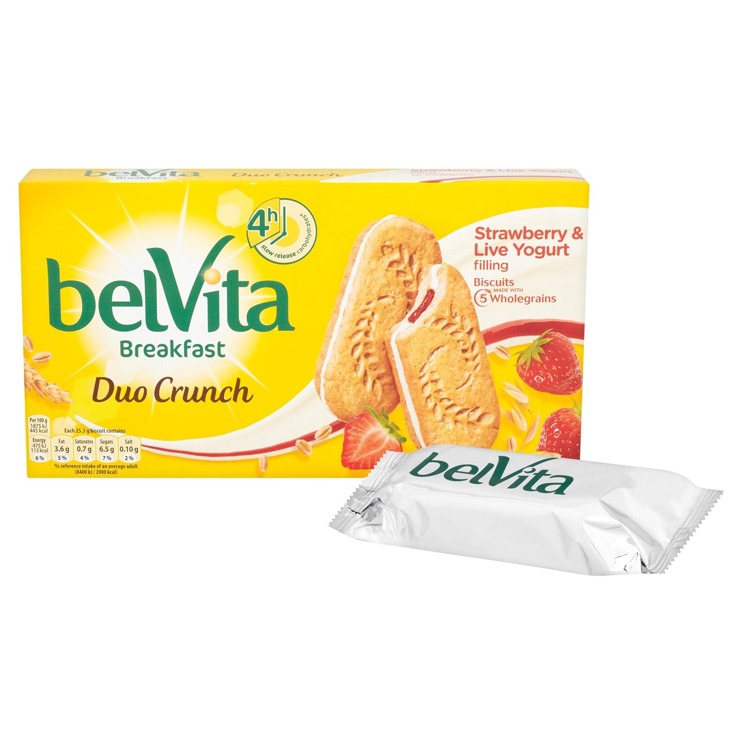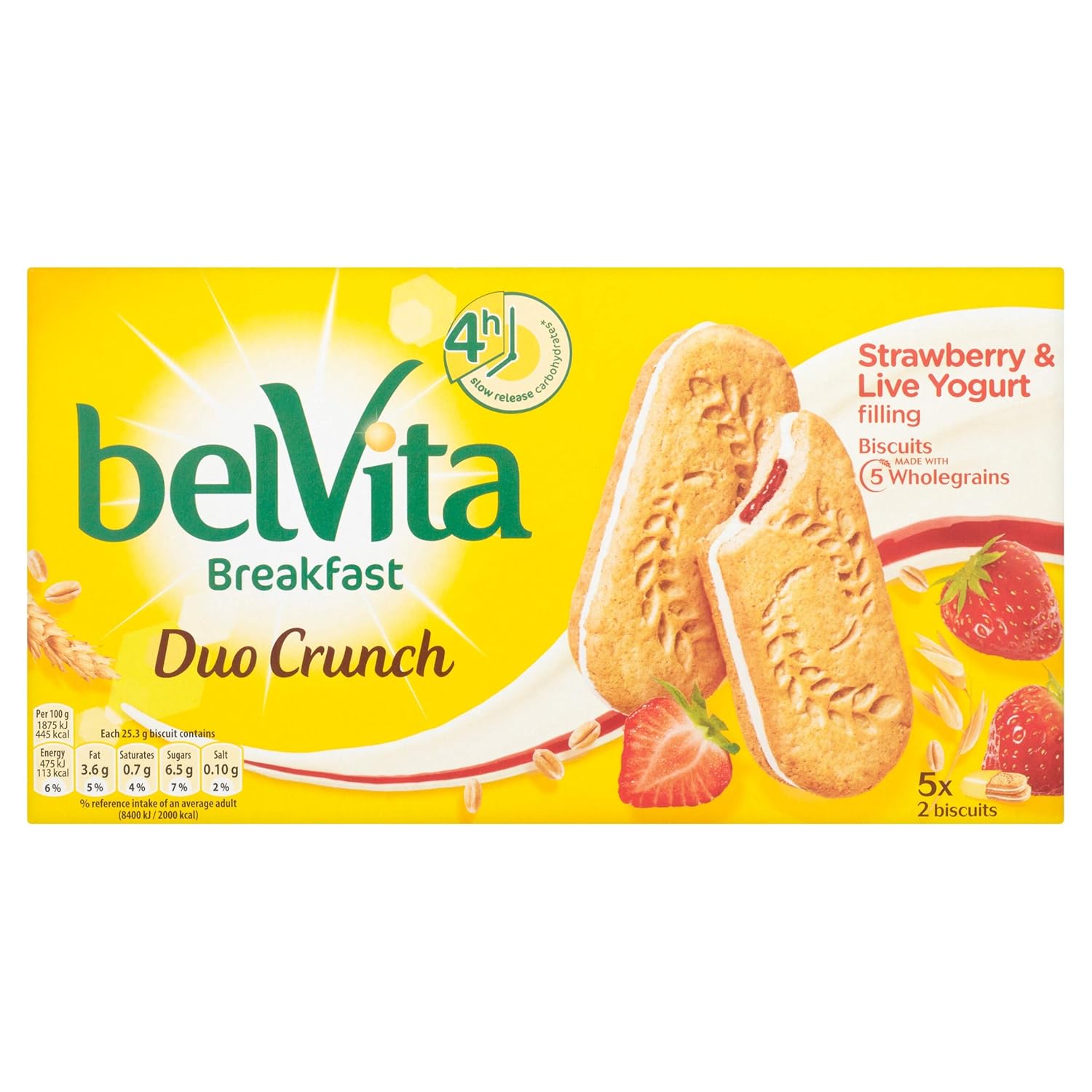 Biscuits made with wholegrain cereals with a yogurt filling (13.5%) and a strawberry and blackberry filling (13.5%) and added vitamins and minerals. It’s important to get a good start to the day with a tasty breakfast. We love biscuits and our nutritionists designed Belvita for biscuit lovers like us, who try to fit in a good breakfast every day. Belvita are more than just a simple biscuit. They are biscuits specially designed for breakfast*. Since their launch, lots of people have enjoyed a tasty breakfast crunch and we’re now delighted to introduce a new and unique dual flavour addition to the range – Strawberry and Live Yogurt filled breakfast biscuits. *Enjoy as part of a balanced breakfast, eg with a portion of fruit and dairy. Belvita Breakfast Duo Crunch are a delicious combination of fruit filling and a creamy live yogurt filling inside a crunchy biscuit. No colours or preservatives