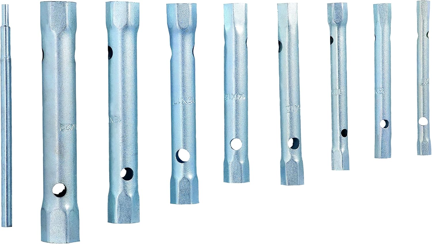 Double ended box spanners in 16 sizes. Includes: 6 x 7 | 8 x 9 | 10 x 11 | 12 x 13 | 14 x 15 | 16 x 17 | 18 x 19 | 20 x 22mm. Also includes sliding bar and wallet.