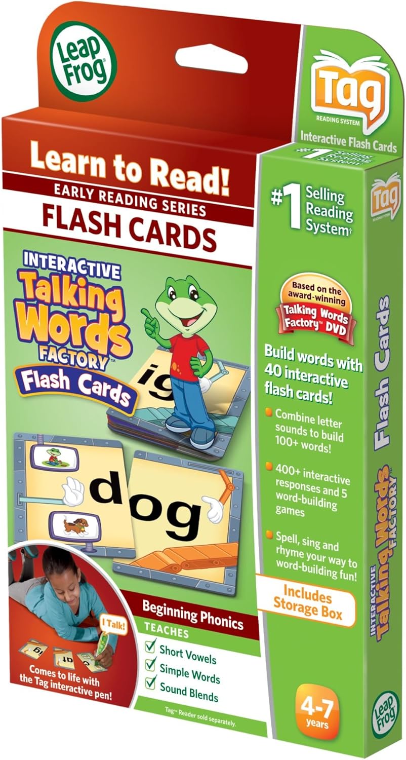 Letter Factory Fun Spell, sing and rhyme your way to word-building fun with 40 interactive flash cards. LeapFrog Interactive Talking Words Factory Flash Cards work with the Tag and LeapReader Writing Systems (sold separately). Recommended for children ages 4-7 years. Touch letters to hear them sounded out and pronounced Mix and match letters to build more than 100 words with short vowel sounds 400+ interactive responses and 5 spelling, rhyming and singing games reinforce word-building fun Turn letters into words at the Talking Words Factory by playing rhyming, spelling and singing games Spot spelling patterns and swap out beginning letters and ending letters to create new words The Early Reading Series is designed to build core phonics skills LeapReader books tap into children’s natural curiosity and inspire them to explore. By connecting LeapReader to a computer you can see your child’s progress, expand the learning with fun activities and get personalized skill insights. Teaches: Word Sounds & Rhymes First Words & Phrases Vowels Spelling Phonics