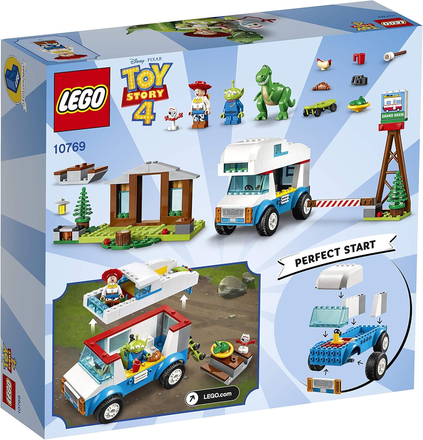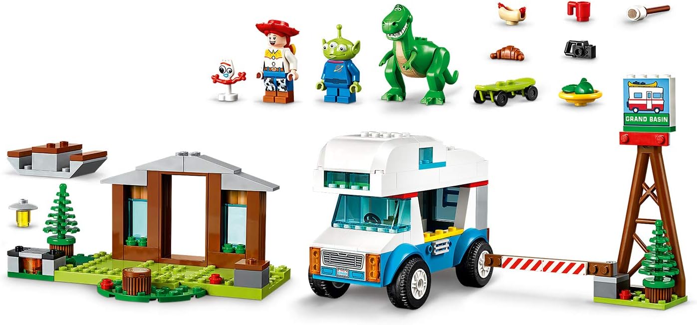 Help your child experience the adventure and fun of Disney Pixar with the 10769 toy story 4 RV vacation LEGO 4+ set. This jaunty set is developed to be fun and easy for preschoolers and youngsters, featuring a recreational vehicle (RV) with starter brick chassis, removable roof and interior with bed, toilet and sink, plus a park building wall with starter brick baseplate, tree, picnic table and a grill. The starter brick pieces help even first-time builders experience the pride of building vehicles, structures and more, all on their own. This LEGO set also includes an RV park sign with tree and opening gate. The included simple guide to build and play will help your young camper understand the purpose of the building steps and grow their imagination and confidence for an ideal start to LEGO model kits in a toy story 4 movie setting. Includes Jessie and Alien minifigures, plus Rex and Forky LEGO figures.