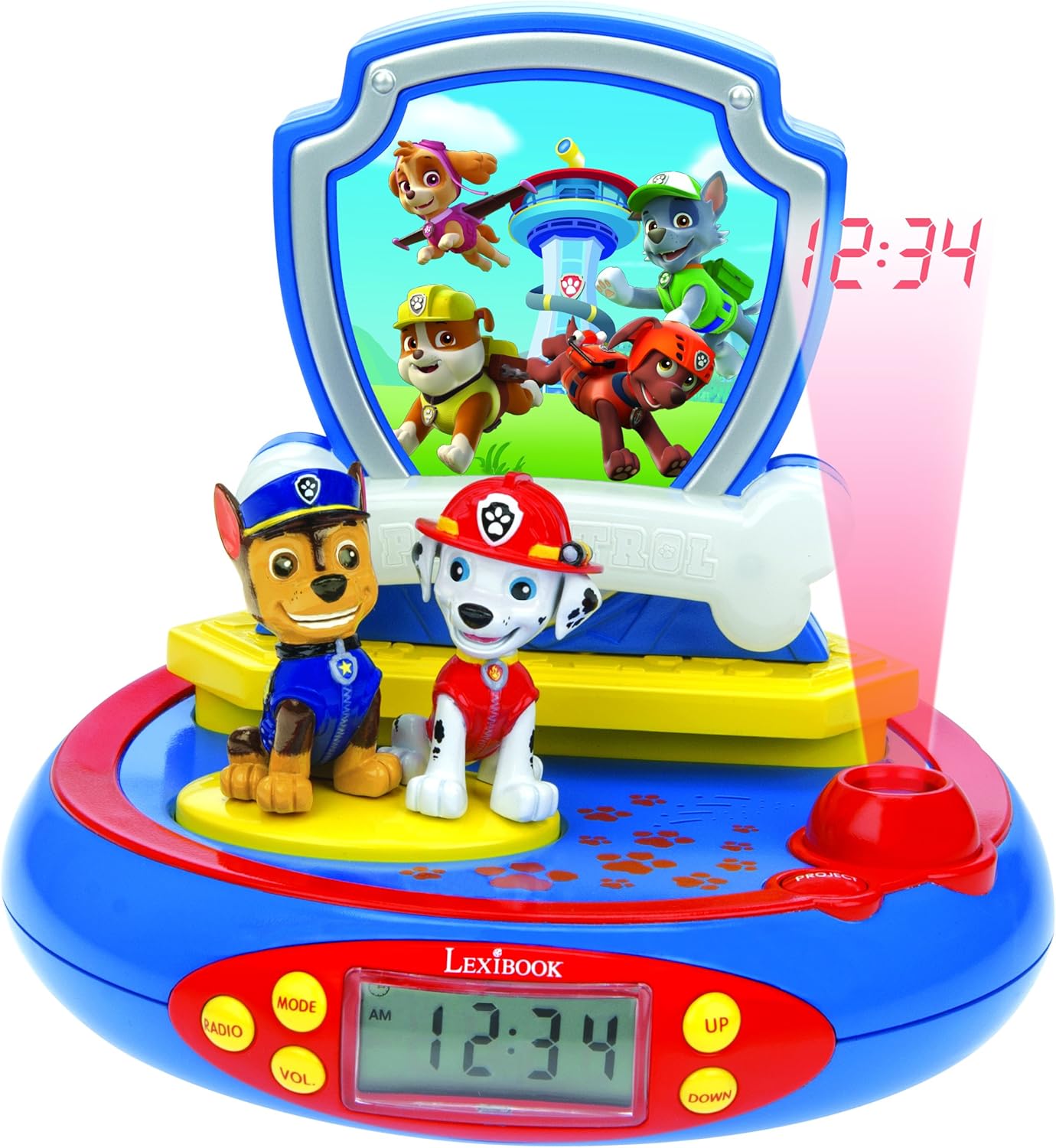 LEXiBOOK Paw Patrol Chase Projector Radio Clock, Built-in Night Light, time Projection onto The Ceiling, Sound Effects, Battery-Powered, Blue/Red, RP500PA