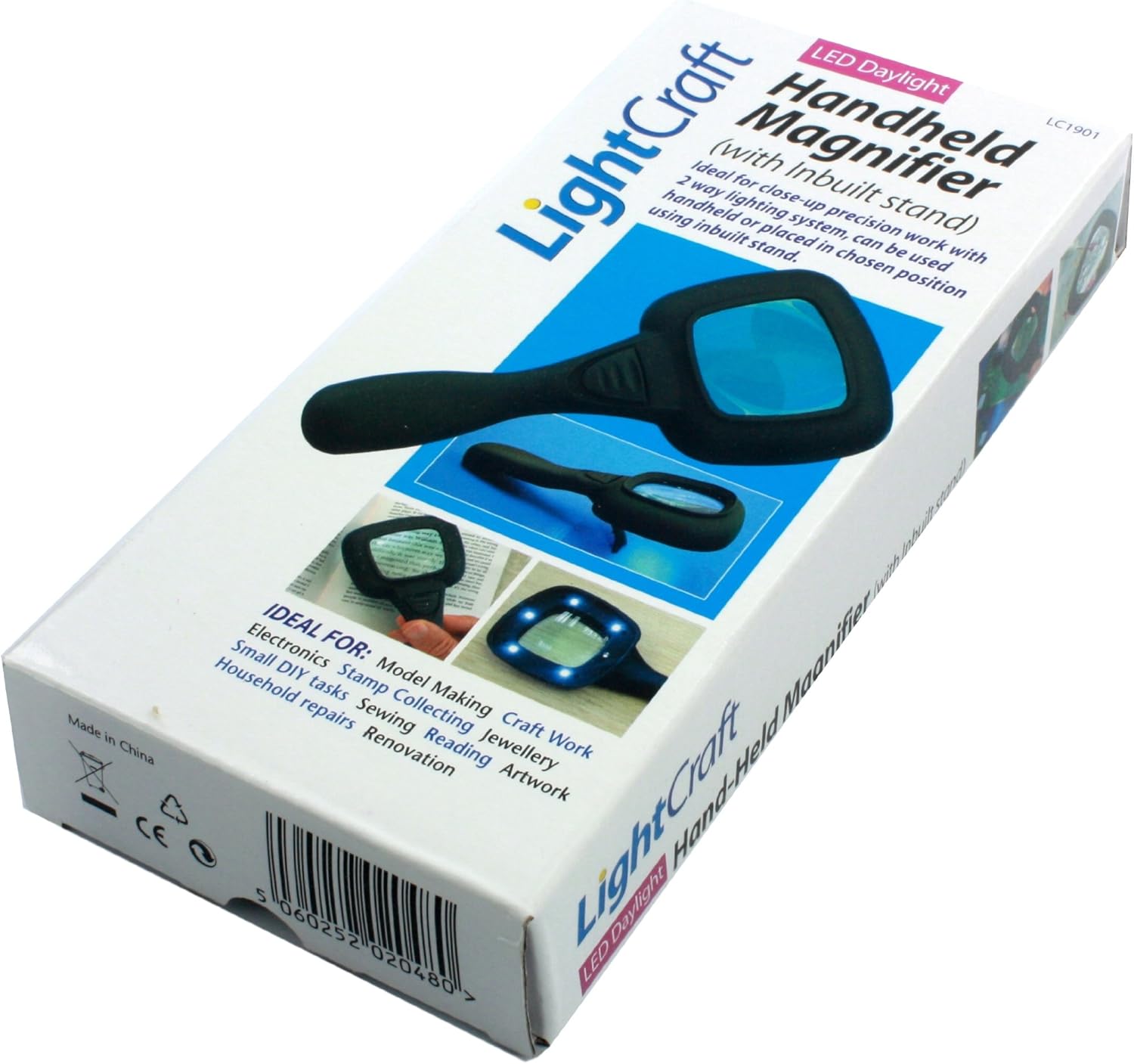 LED Hand-Held Magnifier, ideal for close-up precision work with 2 way lighting system. Can be used handheld or placed in chosen positionu sing inbuilt stand