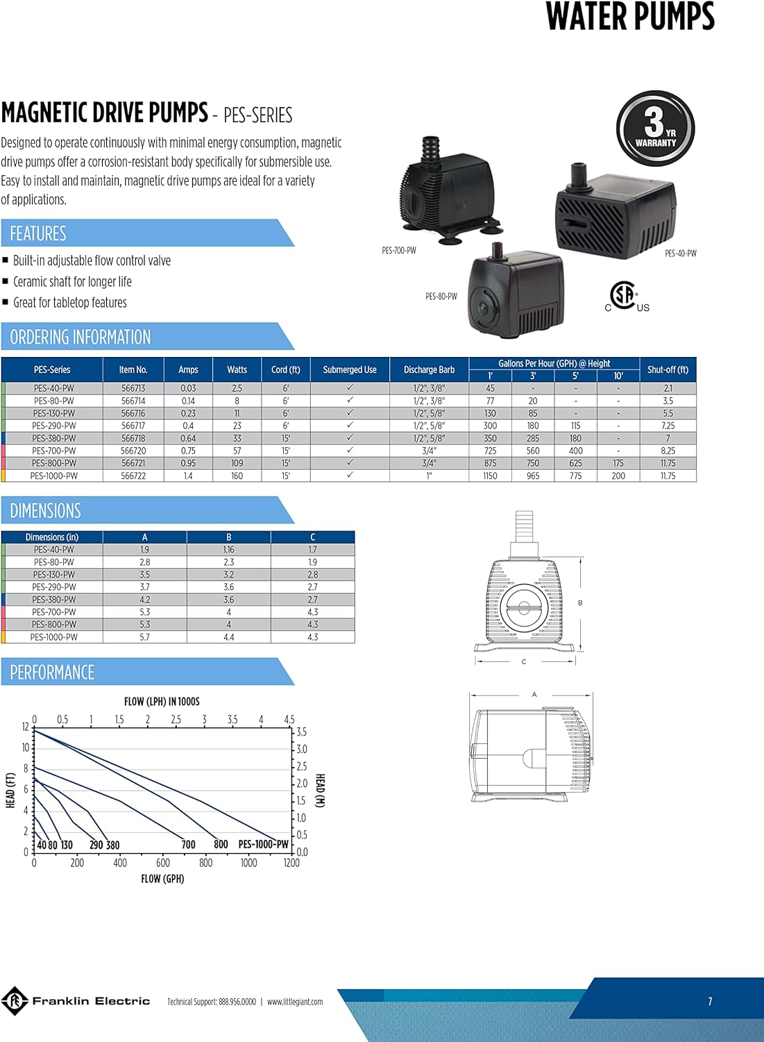 For Tabletop Fountains, Small Waterfalls, Pond Fountains and RecirculationThe Little Giant PES-Series CONTINUOUS DUTY Magnetic Drive pumps are very VERSATILE and can be used for tabletop displays, small waterfalls, pond fountains or recirculation. A wide selection of pumps to choose from ranging from 45 GPH to 1150 GPH. See chart below for details. Note: not all pumps could fit in the chart. For smaller pumps click on the link for the PW-40-PW to view the specification chart for the smaller pumps. |
