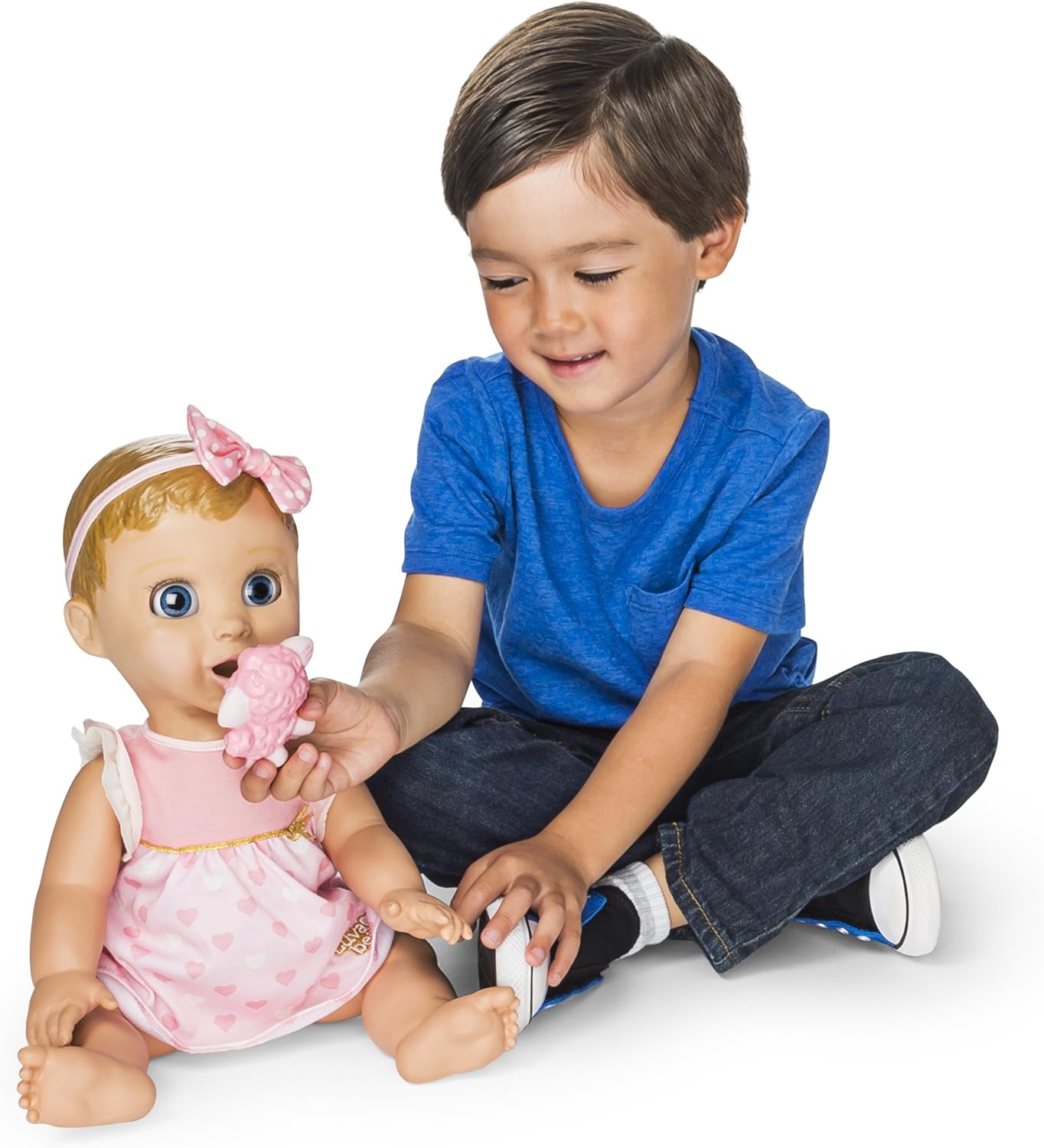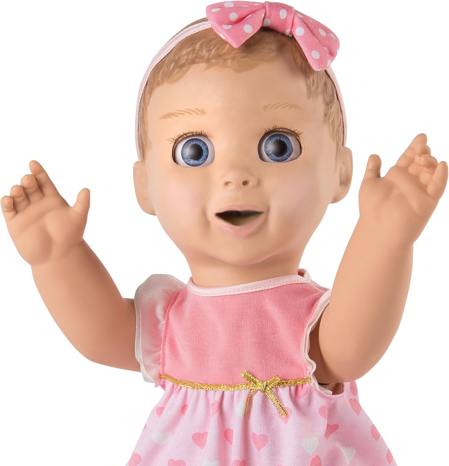 Discover so many real baby surprises with Luvabella! From the moment she opens her eyes and giggles, Luvabella will amaze you with her true-to-life facial expressions and personality! She moves, talks, and plays just like a real baby. Cover her eyes for a game of peek-a-boo, tickle her tummy and toes to make her giggle, or place a hand on her chest to gently listen to her heartbeat. The more you play with her, the more she’ll talk – her babble will transform into over 100 clear words and phrases. Caring for Luvabella is fun with her four interactive accessories: use her spoon to feed her, help her learn new animal names and sounds with her Lamby toy, lull her to sleep with her bottle, and if she gets fussy, all she needs is her soother. Bring love home today!