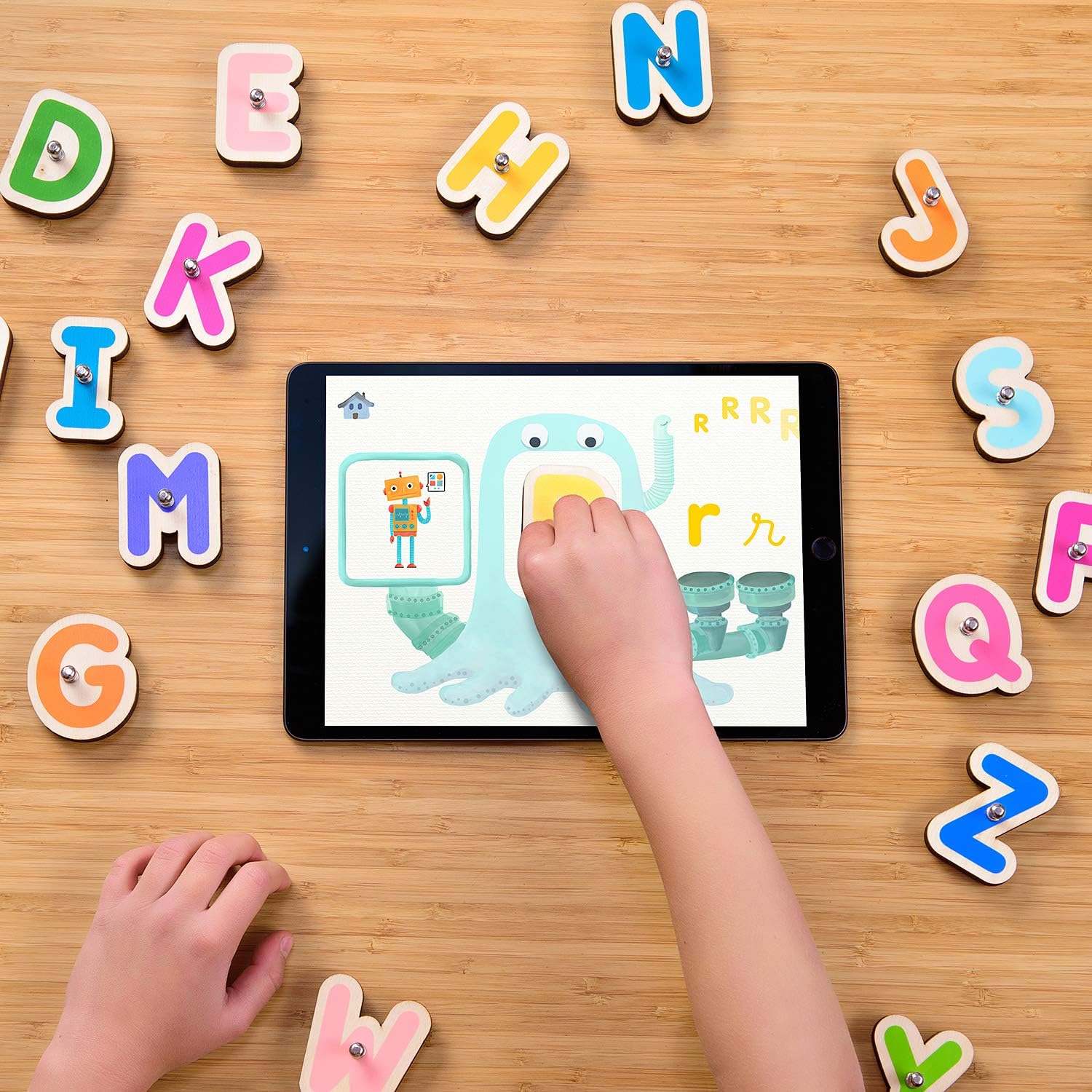 Tactile and movement stimulations are very powerful for young kids! That's why our kit is composed of wooden letters that are recognized by the screen through a patented technology. It has been thoughtfully designed to appeal to young learners and stimulate their thirst for exploring.