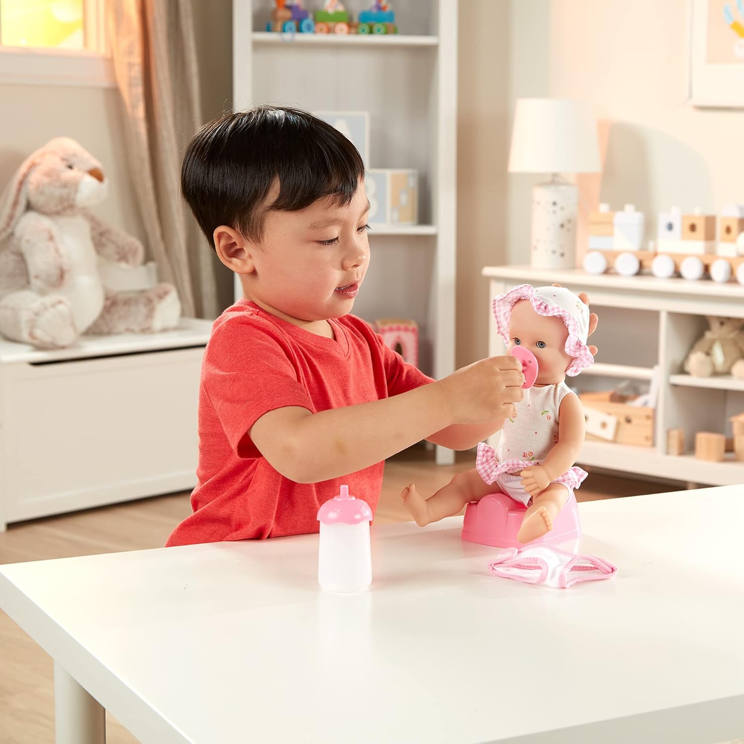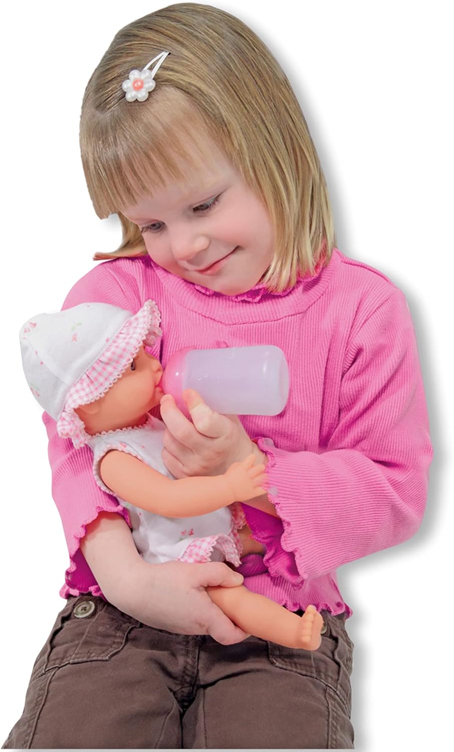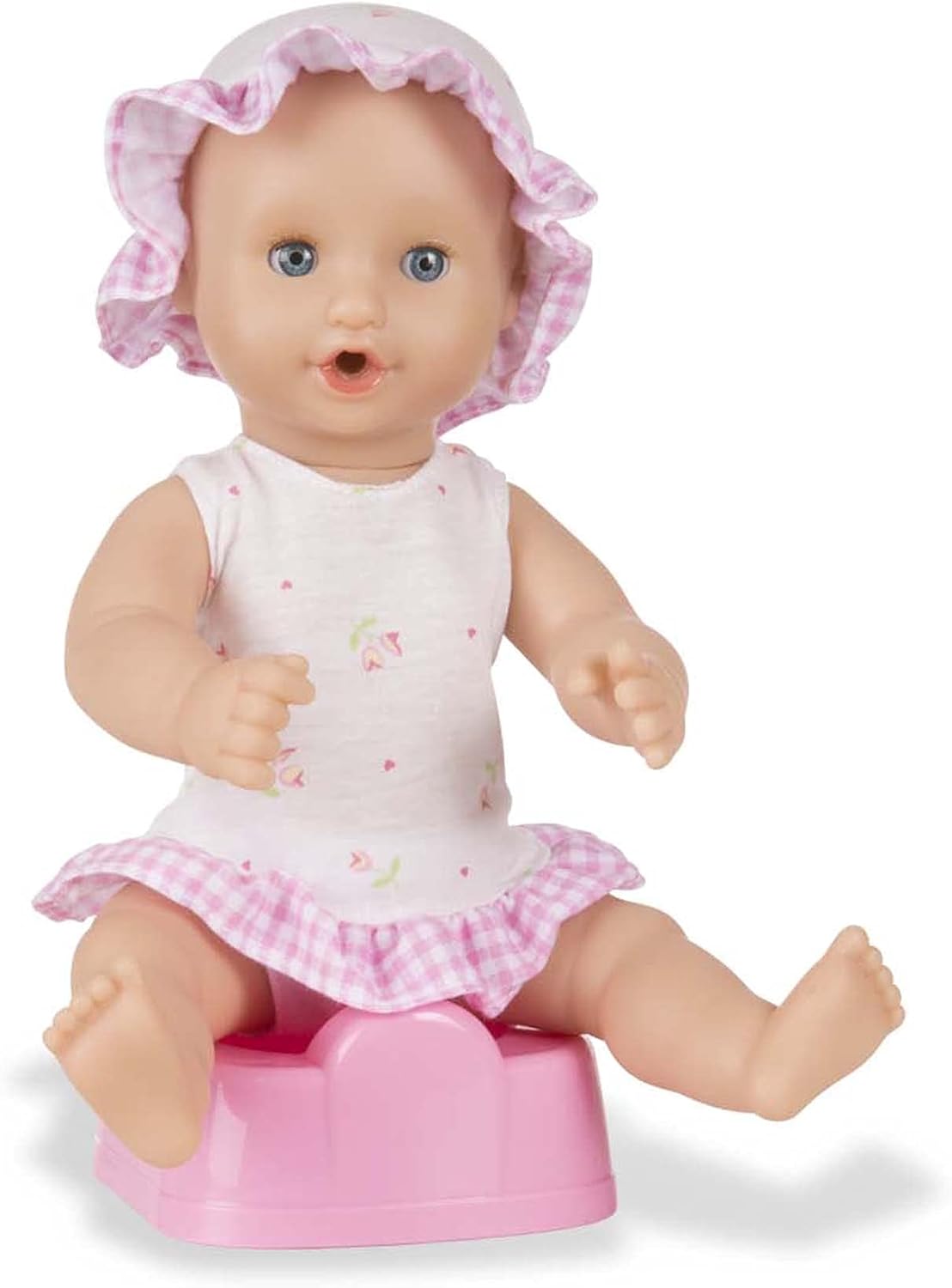 Little mommies will love cuddling with this posable baby doll, perfect for bath-time play. Annie has open-and-close eyes, can “drink” from her bottle, and can sit on her very own potty chair. She also comes with a pacifier and a pink-trimmed, self-stick diaper. Dressed in a charming, gingham and flowered sundress, underpants, and matching bonnet, Annie will be a lovable addition to anyone’s doll family.