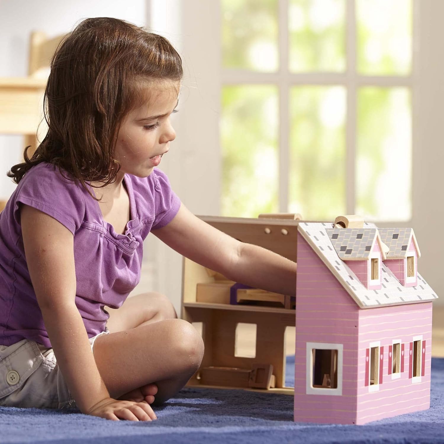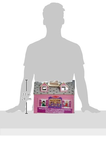 This wooden portable dollhouse is designed to open fully and give kids easy access for a more enjoyable playing experience. It also comes fully assembled, so children can simply fold it open to begin their playtime. This two-story wooden dollhouse allows kids to arrange furniture and open and close doors, and it stimulates their creativity by allowing them to interact with the two wooden play figures. Kids will learn about shapes by locating rectangles, squares, and more, and develop fine motor skills while engaging in storytelling and imaginative play. The Fold and Go Mini Dollhouse is a creative and thoughtful gift for kids ages 3 to 6. Add the Melissa and Doug Poseable 7-Piece Wooden Doll Family Set to round out the pretend play experience and give kids an engaging option for screen-free fun.