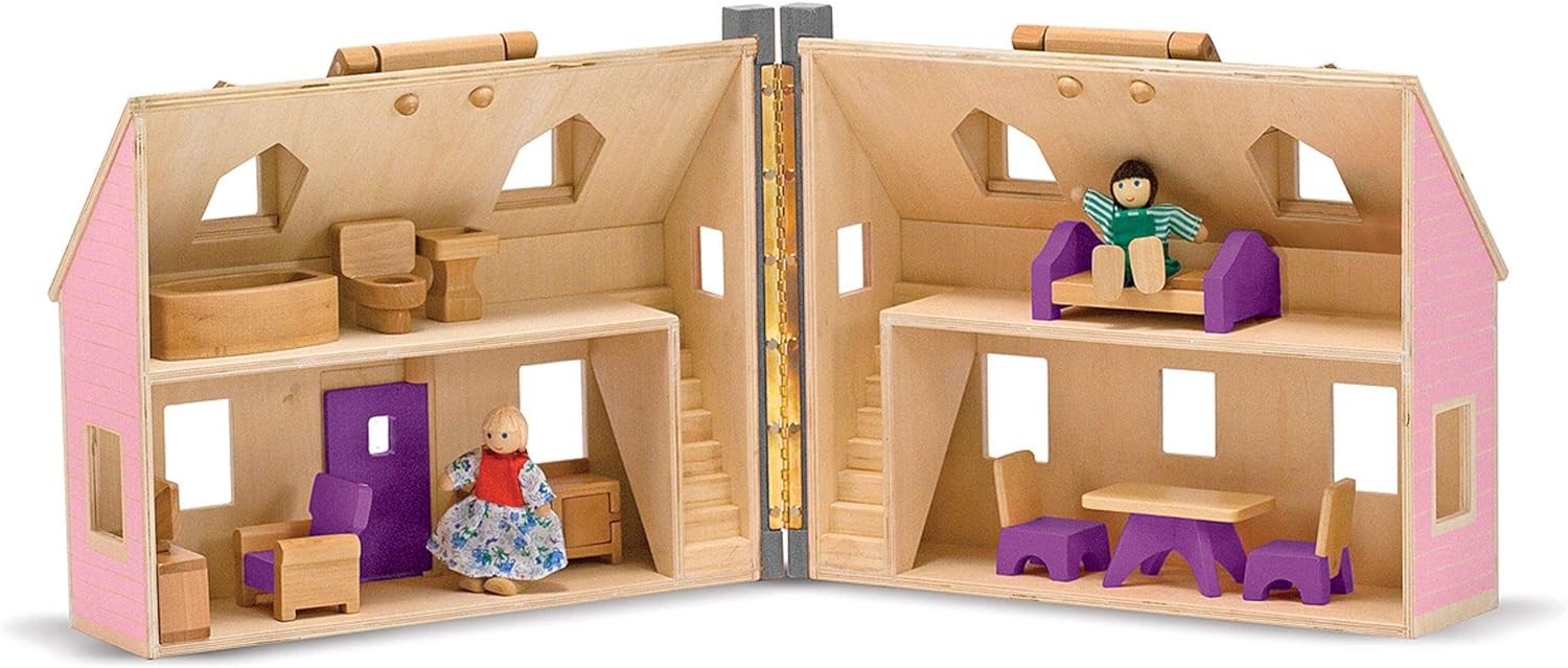 Enjoy a “home away from home” with this delightful wooden dollhouse. Two flexible wooden play figures live in this house with 11 pieces of wooden furniture. The dollhouse opens for easy access and folds closed for convenient storage.