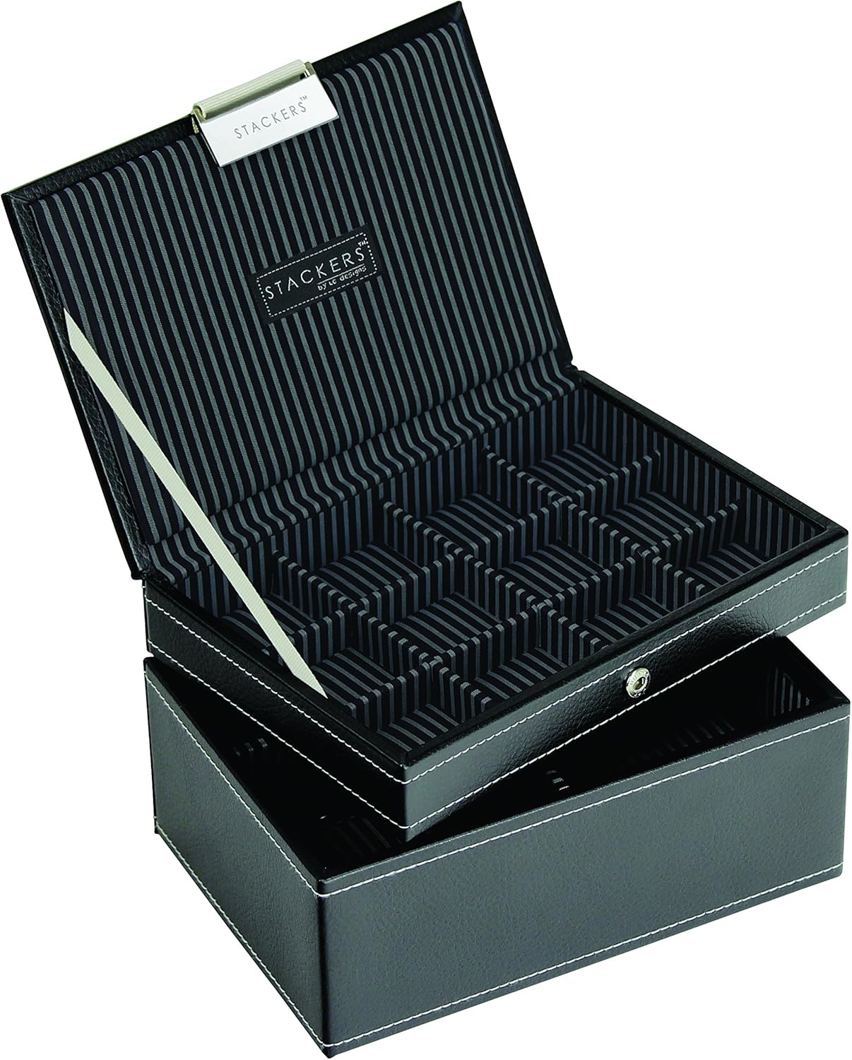 The Ultimate Watch & Cufflink Box, Available in five stylish colours. The combination of practical design and sophisticated styling, makes this Men’s STACKER an ideal storage solution for cufflinks, rings and jewellery. Lidded STACKER is designed with a secure popper closure for those short holiday breaks and business trips. Watch STACKER designed with two removable extra-large watch pads which will hold two over-size watches, or, four standard size watches.