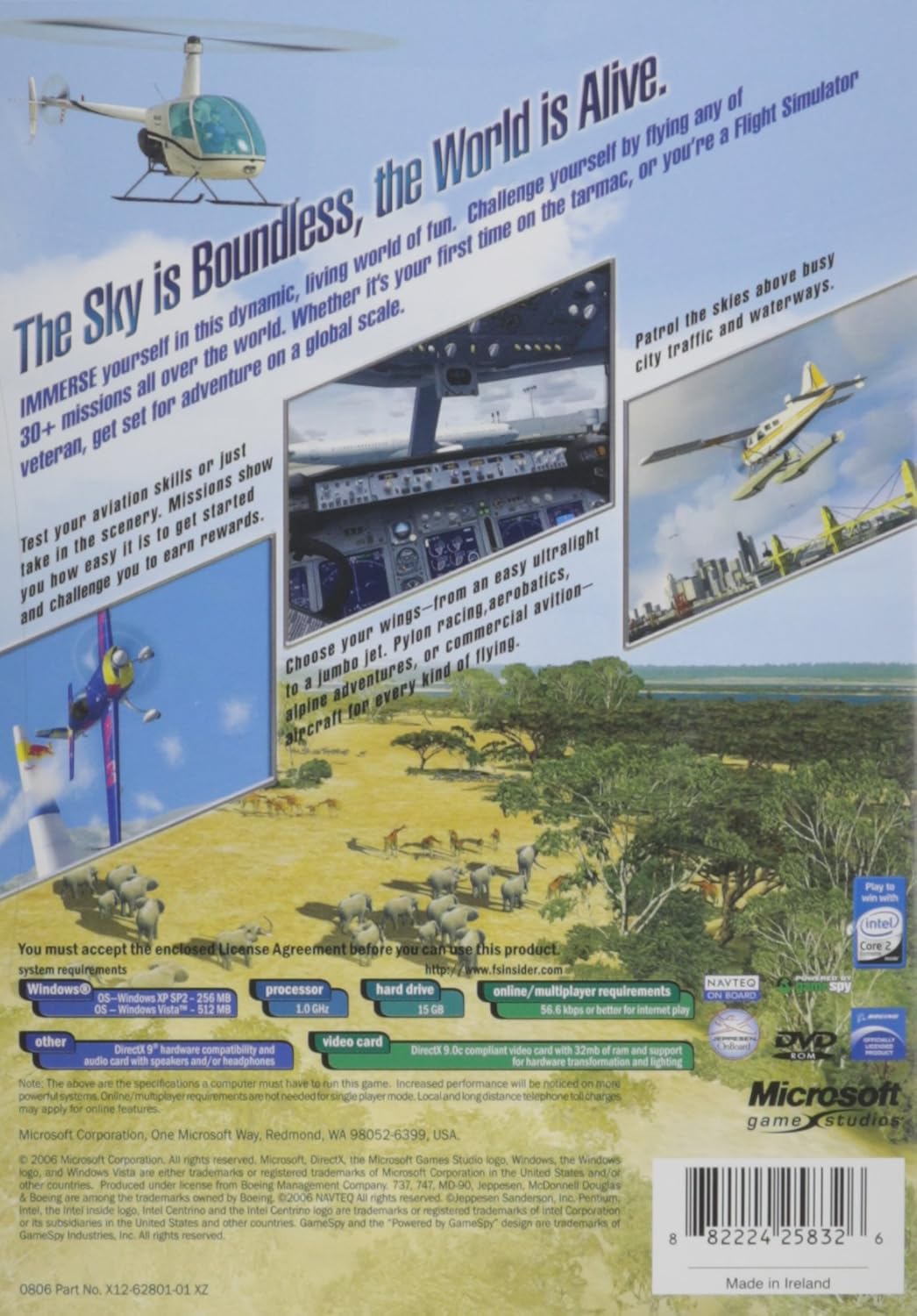 Flight Simulator X offers players a rich and innovative gaming experience with new technological advancements, incredible graphics and added realism, including weather, time of day and seasons. Pilots can watch moving cars and detailed buildings in cities below, traffic on highways, indigenous houses, farmland and livestock, and wildlife in their natural habitats.