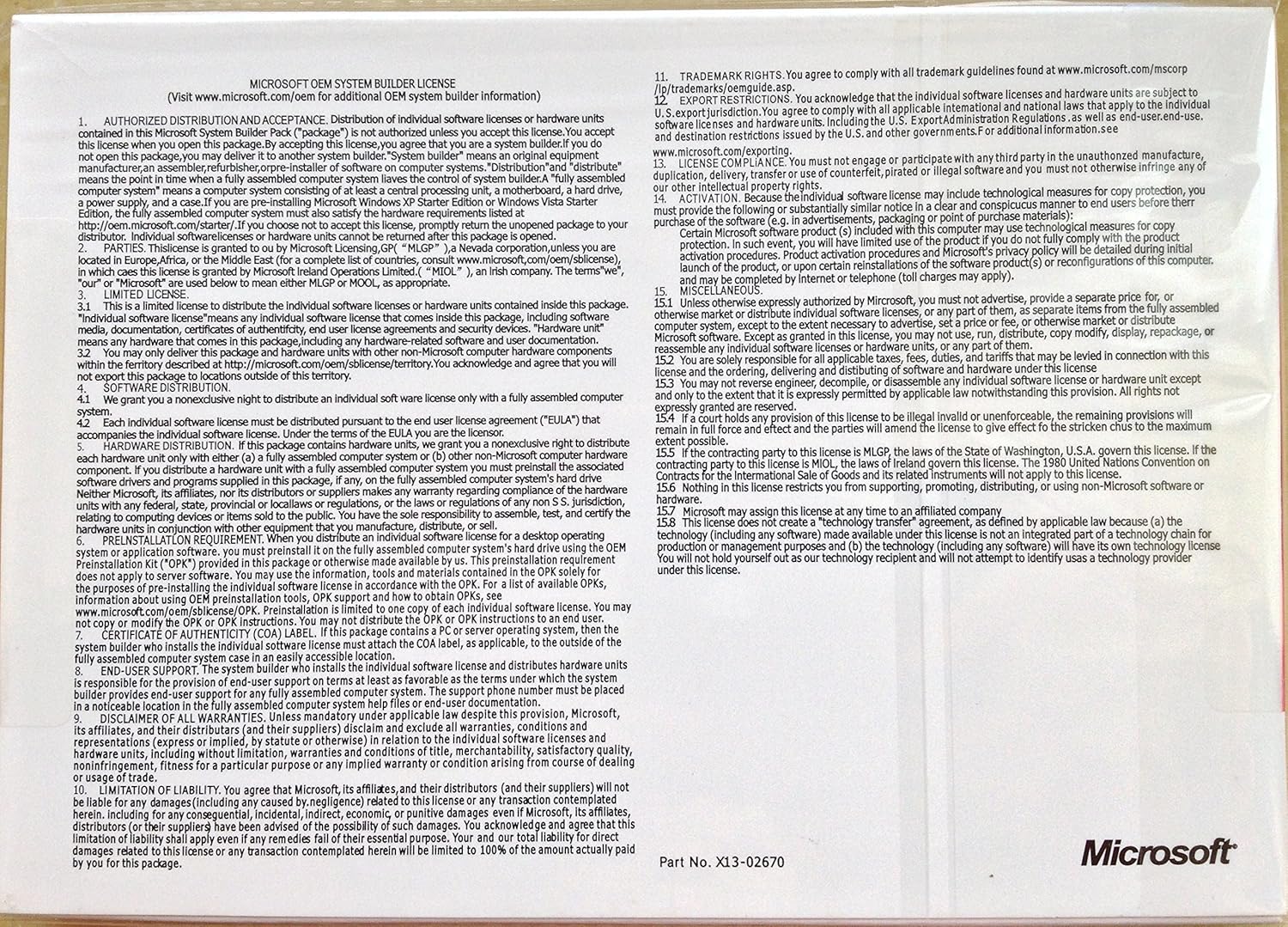 Use of this OEM System Builder Channel software is subject to the terms of the Microsoft OEM System Builder License. This software is intended for pre-installation on a new personal computer for resale. This OEM System Builder Channel software requires the assembler to provide end user support for the Windows software and cannot be transferred to another computer once it is installed. To acquire Windows software with support provided by Microsoft please see our full package “Retail” product offerings.