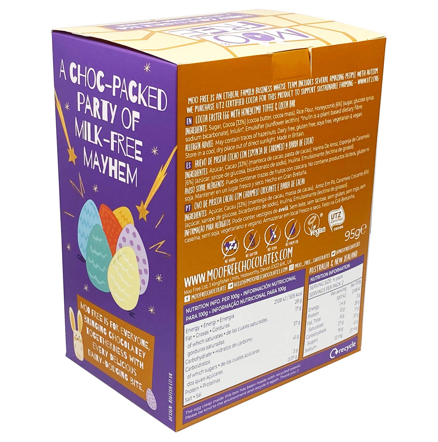 Mikey Bunny was upset when he discovered that some people couldn’t eat milk chocolate Easter eggs. Then he met Hammy Hamster and her Moo Free friends. Hammy makes amazing, dairy free eggs that taste just like milk chocolate. So now Mikey Bunny is very happy because everyone can have a delicious Easter egg. These dairy free Easter eggs are made using Hammy’s multi-award winning organic rice milk chocolate. Each dairy free and gluten free Easter egg is then packed into cute and unique Easter egg boxes that feature Mikey Bunny. Our dairy free and vegan Easter eggs are perfect for kids or adults of any age who have food allergies, are vegan or simply enjoy fun, quality chocolate. This dairy free, gluten free and soya free Easter egg is unique. We don’t believe that you will find another organic, milk chocolate tasting, dairy free Easter egg like this manufactured anywhere else in the world. Each dairy free Easter egg is made in our UK factory that does not manufacture milk chocolate or any other milk based products. As with all of our dairy free chocolates our dairy free Easter eggs are made using a combination of natural, organic and ethically sourced ingredients.
