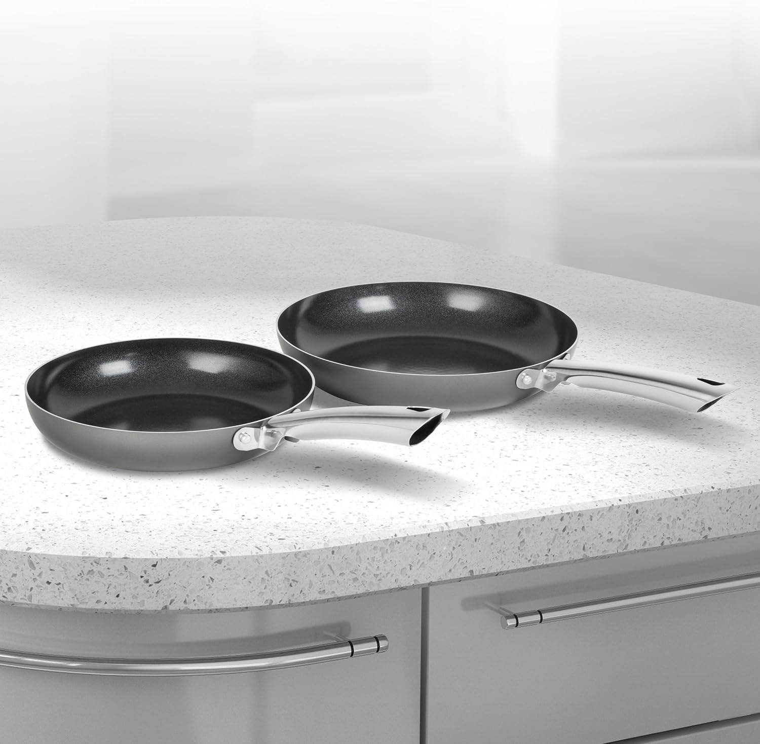 Cook a range of delicious foods with the-non-stick ceramic coating, allowing you to cook with little to no oil for healthier, even cooking and enhanced durability. Made with pressed aluminium to enhance wear resistance, you can be sure that this set of frying pans can withstand continuous use for quality cooking time after time. With a stylish Titanium exterior coating and stainless steel handle to ensure optimum comfort and safety, you can put the fun back into creating delicious dishes. Suitable for all hob types including induction with a hand wash only, wipe clean body, this frying pan is the ultimate in easy, efficient cooking.
