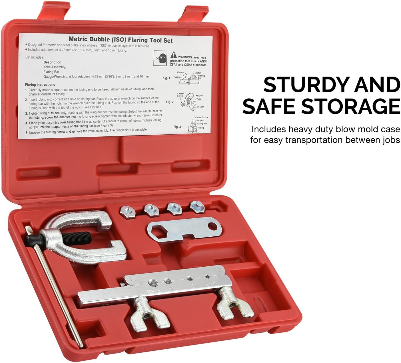 - [INCLUDES]: Yoke assembly, Flaring bar, Gauge/wrench, 10mm tubing, 4 adapters for 4.75mm, 6mm, 8mm for a complete bubble flaring tool set.