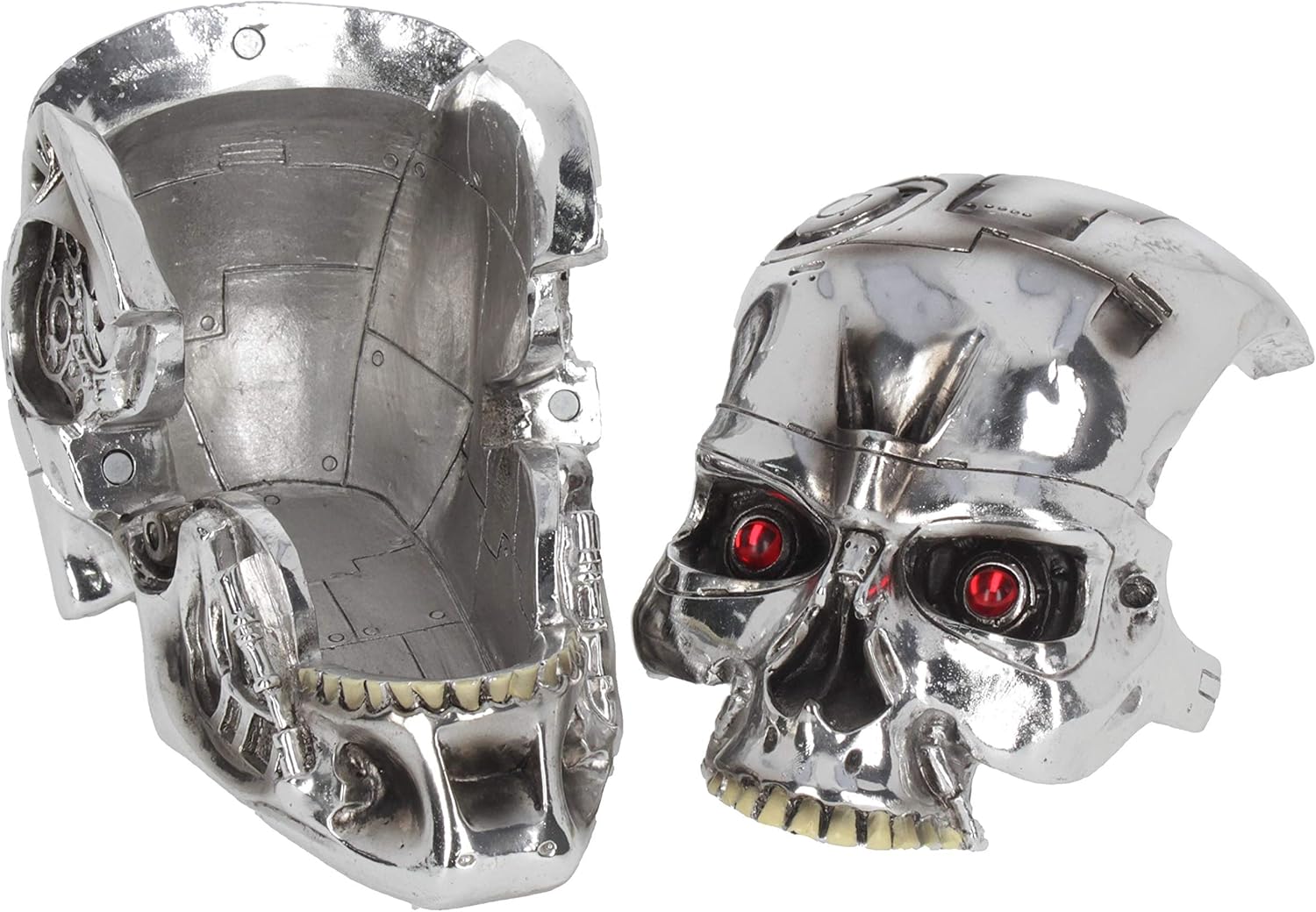 BoxesSent back in time from the future, these officially licensed boxes show a T-800 Terminator that has shed all human flesh, exposed hydraulics overlaid on a metallic skeletal structure that mocks humanity. Red eyes stare menacingly. The top of the skull on each box can be removed to reveal a surprisingly spacious storage space. Cast in the finest resin before being carefully hand-painted, they are the perfect way to keep precious keepsakes safe from the android menace. |
