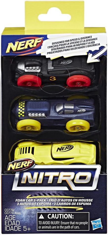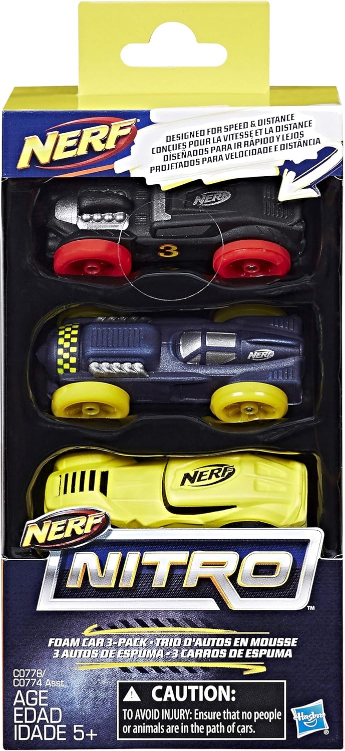 Blast into overdrive! Kids can create awesome stunts as they fire foam cars from blasters that feature the power and performance of the Nerf brand! Blast into stunts to go high, go far, go fast! This set includes 3 foam cars for use with Nerf Nitro blasters (each sold separately).