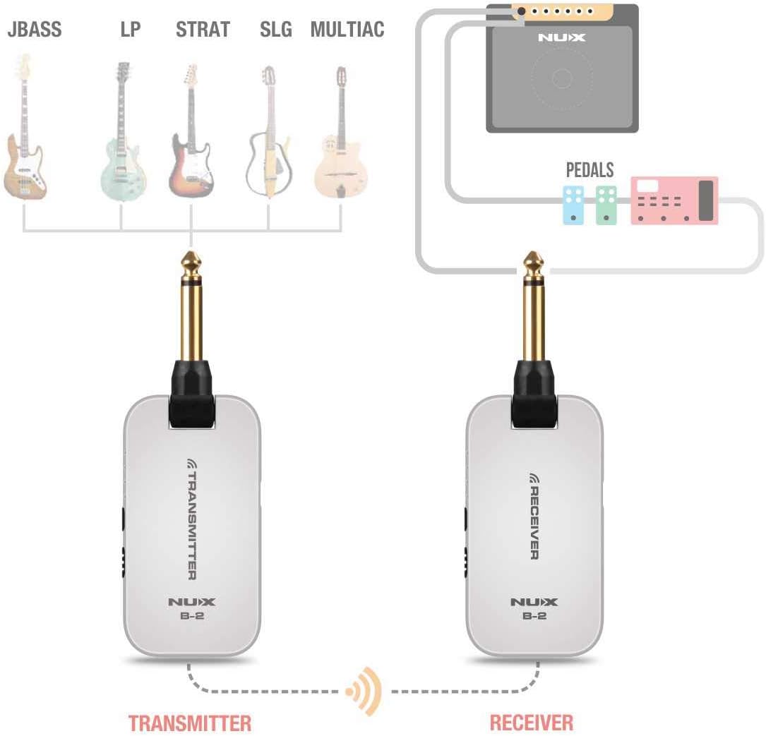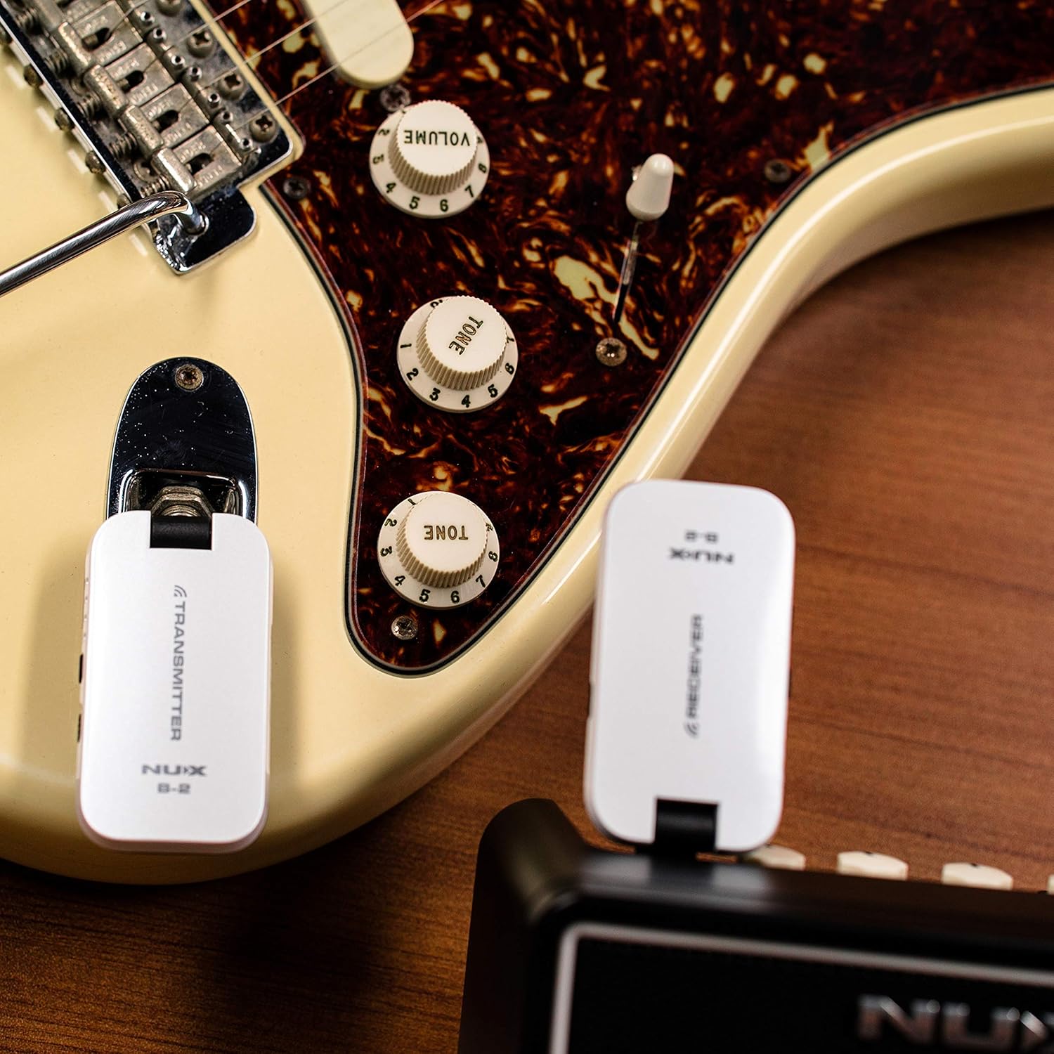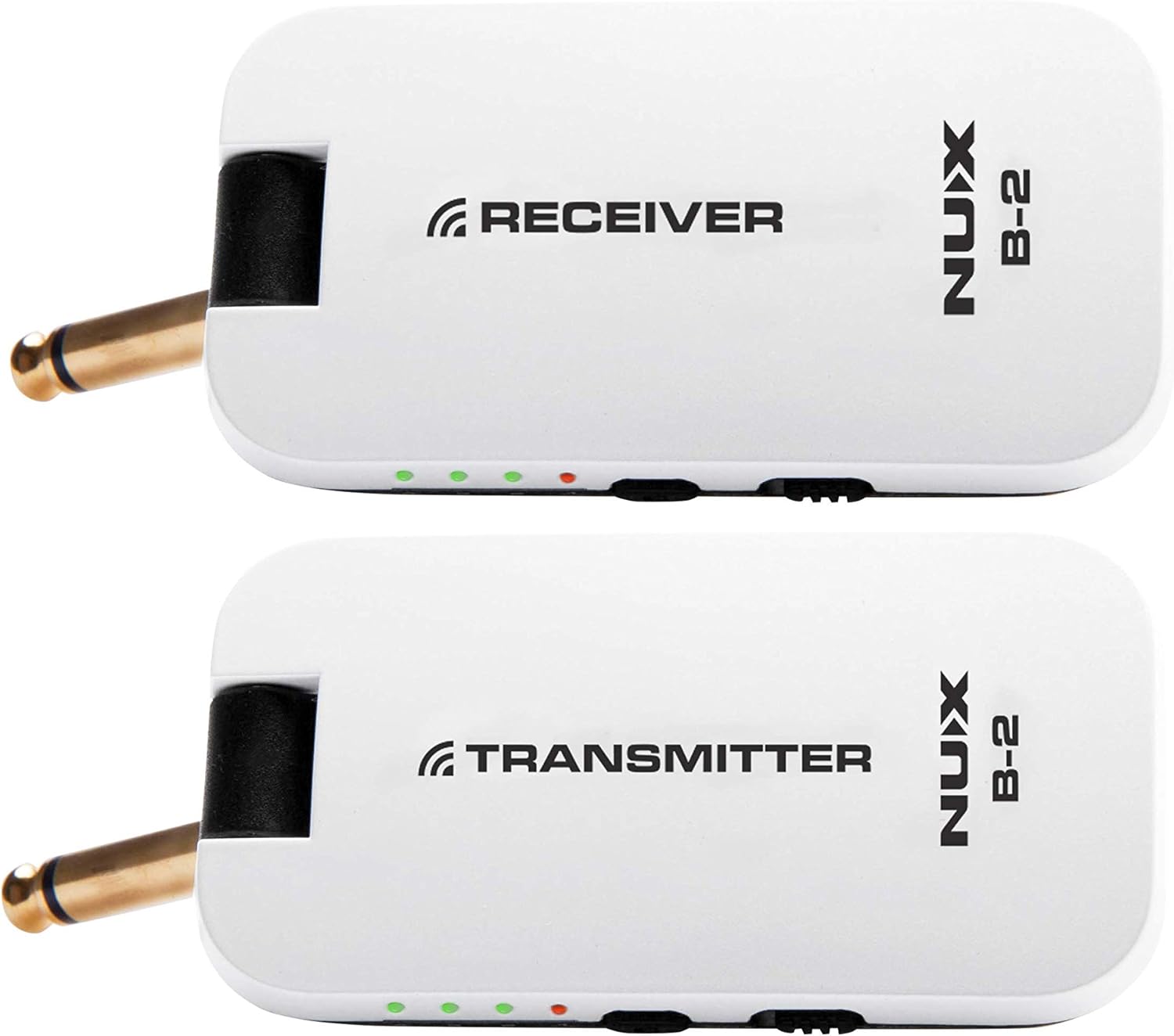 NUX B-2 Guitar Wireless System 2.4GHz Rechargeable 4 Channels Wireless Audio Transmitter Receiver 4ms Latency 48KHz Sampling 32bit Audio Quality 100 Feet Walk Range for Passive Pickup (White)