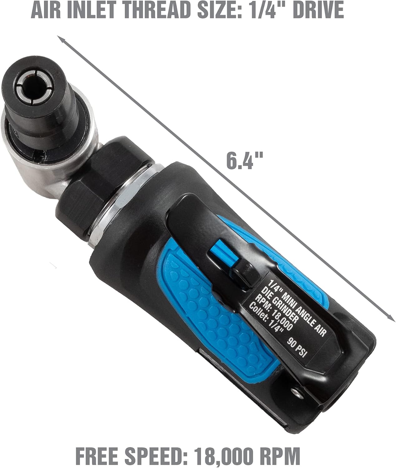 • PRODUCT SPECIFICATIONS: Includes: Angle Air Die Grinder and 2 Wrenches; Weight: 0.9 Lbs.; Collet Size: 1/4 Inches; Air Consumption: 2.8 CFM @ 90 PSI; Free Speed: 18,000 RPM; Air Inlet Thread Size: 1/4 Inch Drive; Length: 6.4 Inches; Angle: 90 Degrees